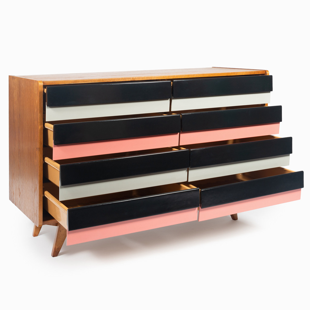 The U-453 cabinet is suitable for any room, it is compact and relatively light, so it is easy to handle. The cabinet has eight drawers in grey and pastel pink with black handles and a veneered (oak) finish. The base is solid spruce. We have consulted Jiří Jiroutek, from whom we also have the exclusive right to renew the production of the entire U-450 series since 2018.
