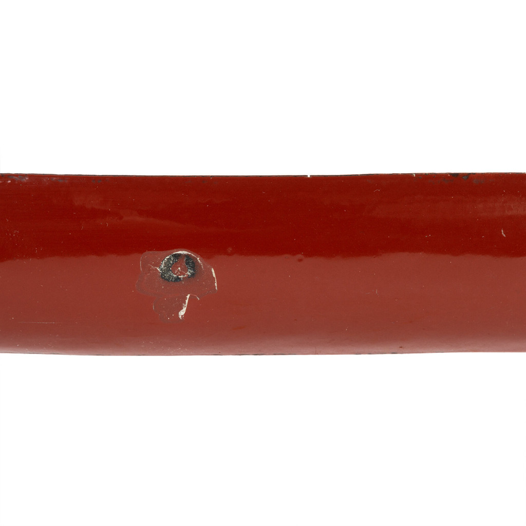 An enamelled letter originally from a notice board. It is painted dark red, but the paint is damaged in some places. The original bracket on the back side is also damaged.