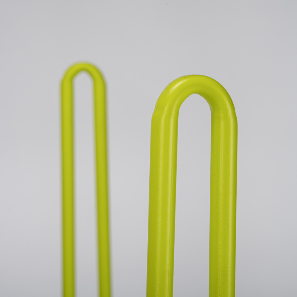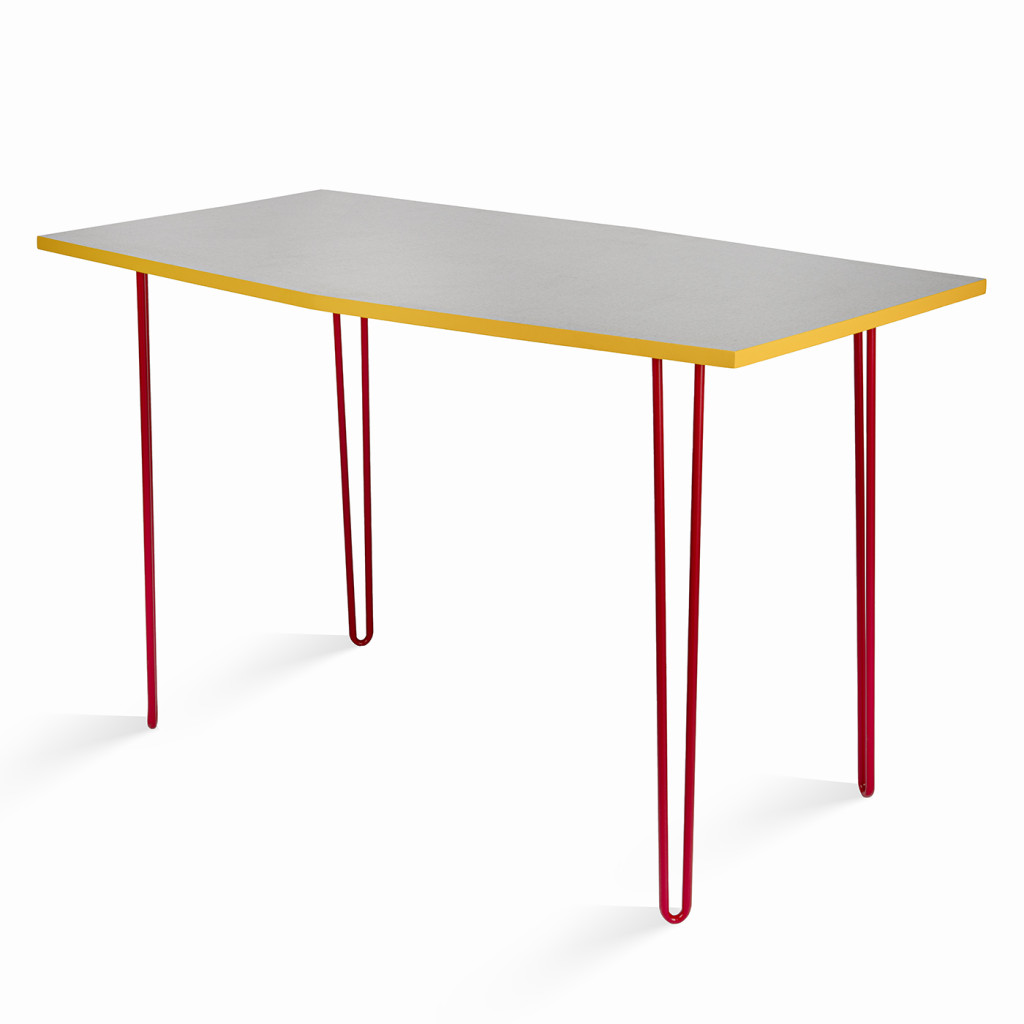 The tops have a slightly asymmetrical shape and are made of a combination of plywood and umacart (paper composite panels) in a white-grey shade with yellow trim. They rest on tall legs made of bent steel with a cross design. The table legs are painted red, the chair legs purple, orange, light blue and light green.