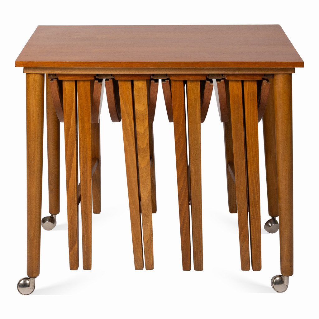 This wooden set consisting of a table and four folding stools was probably designed in the 1960s and inspired by Danish designer Paul Hundevad's design for Nový domov. Multipurpose design became standard in Scandinavian furniture in the mid-20th century, and Hundevad incorporated this approach into many of his creations, such as sideboards and dressers. This set differs from the original in small details, including the shape of the legs, which are square rather than round.