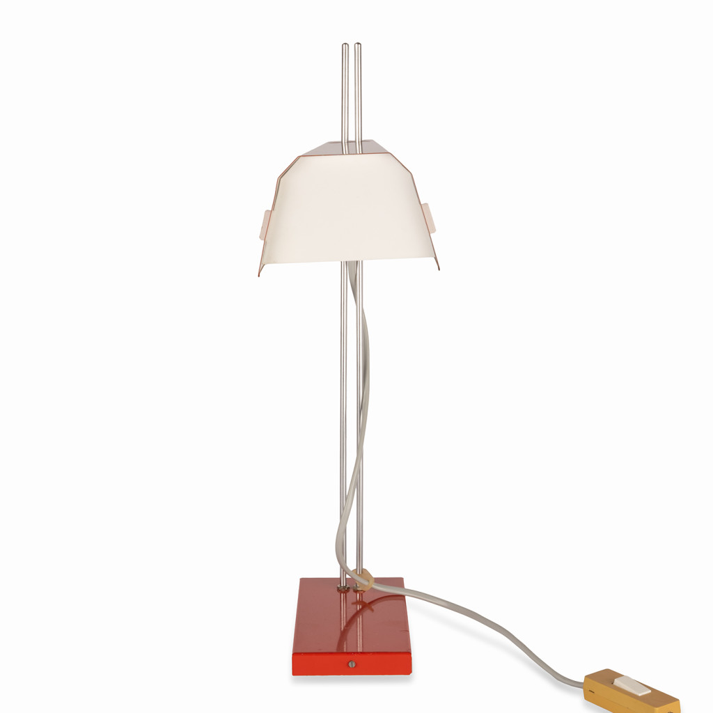This lamp features a chrome-plated steel leg and a deep red, square steel shade with an adjustable height. It lights up with one E27 bulb.