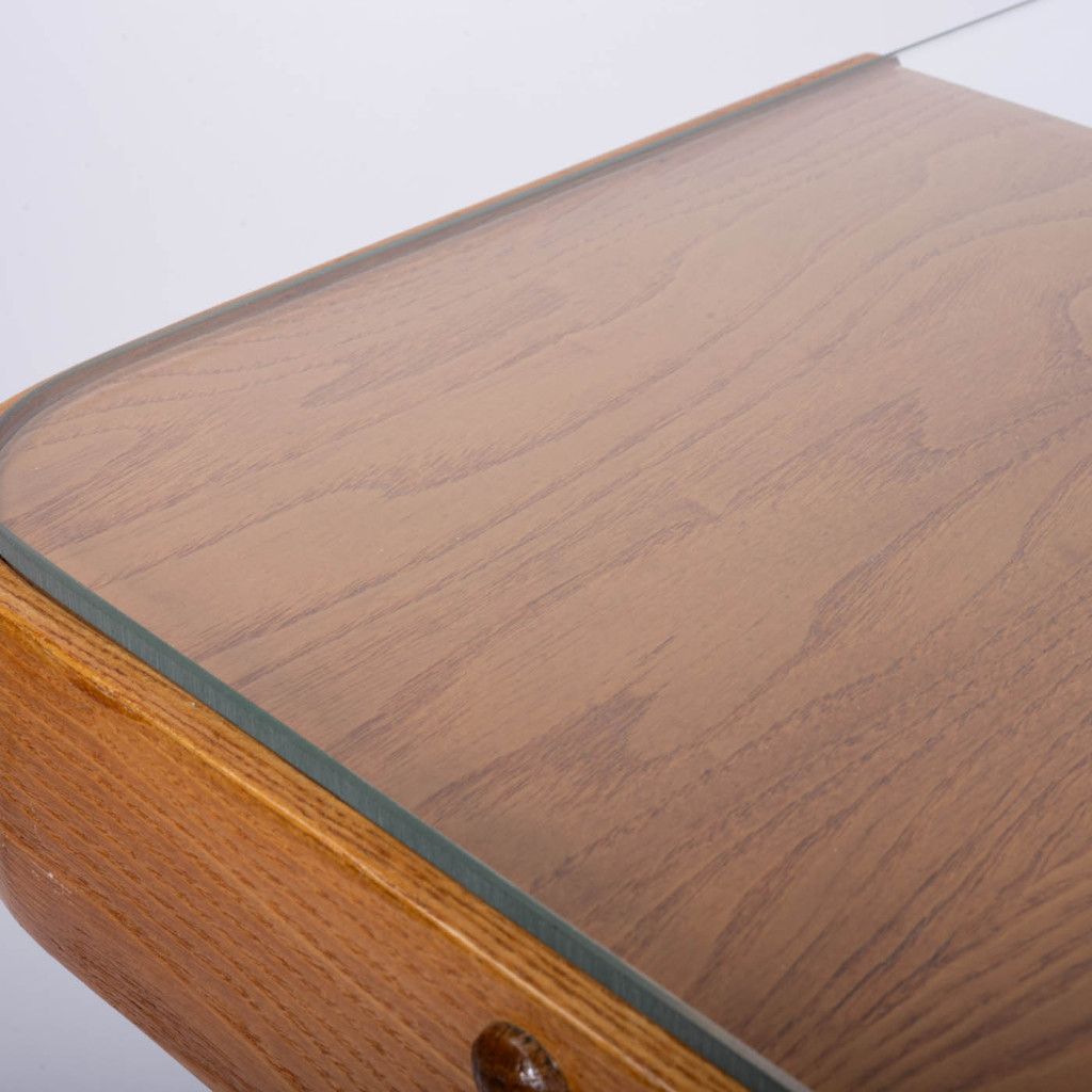 Wooden coffee table produced in the 1950s by Tatra nábytek Pravenec and designed by František Jirák. The table is made of solid oak in a light brown shade and features a new glass top. It is in great condition after a complete renovation in our workshop.