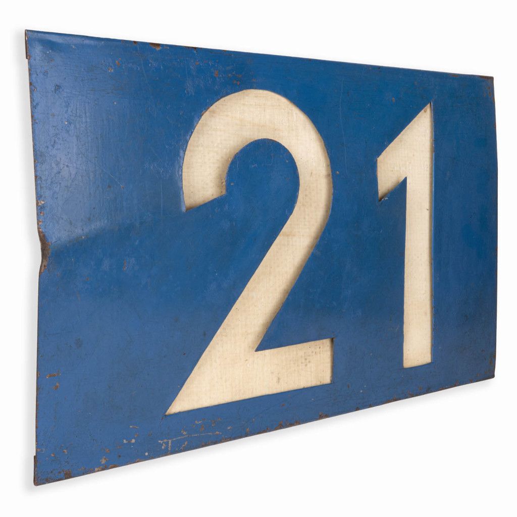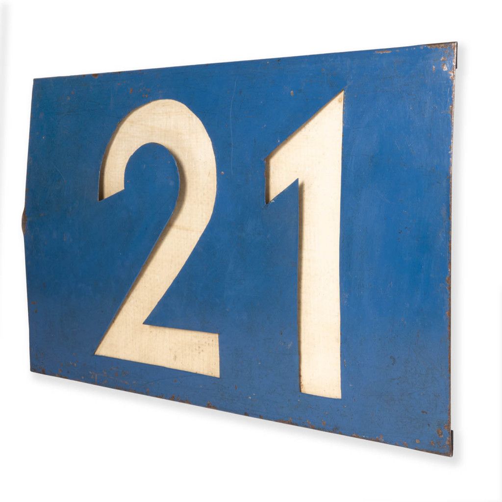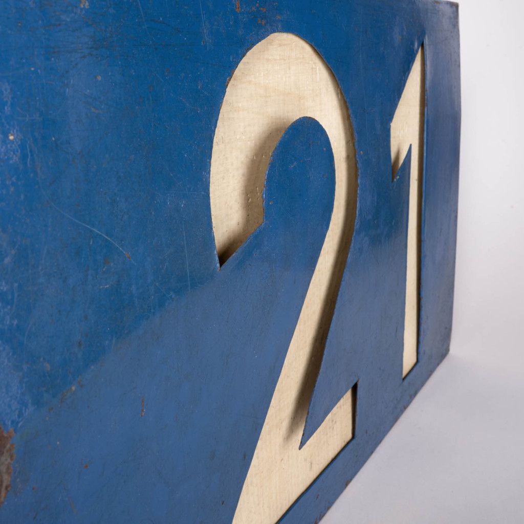Original sign from the old Czechoslovak tram line No. 21 from the 1980s. It is comprised of a light-coloured panel set into a blue metal plate with a cut-out for the number. The sign is in good original condition with a visible patina, as can be seen in the photos. The metal is slightly warped and has various scratches.