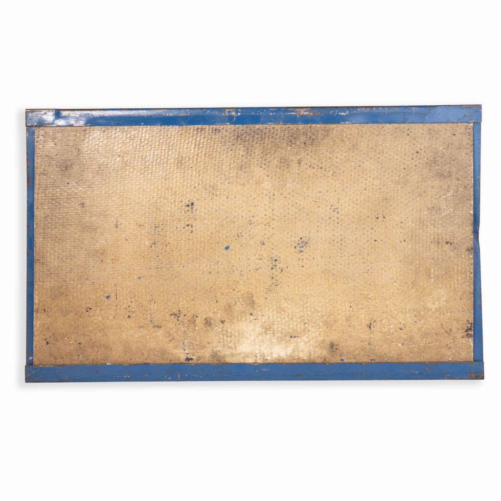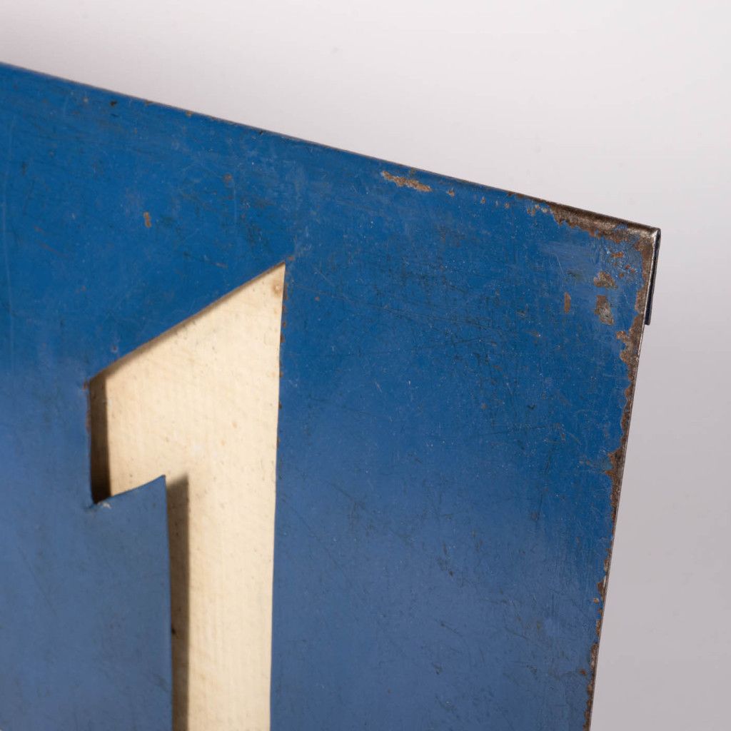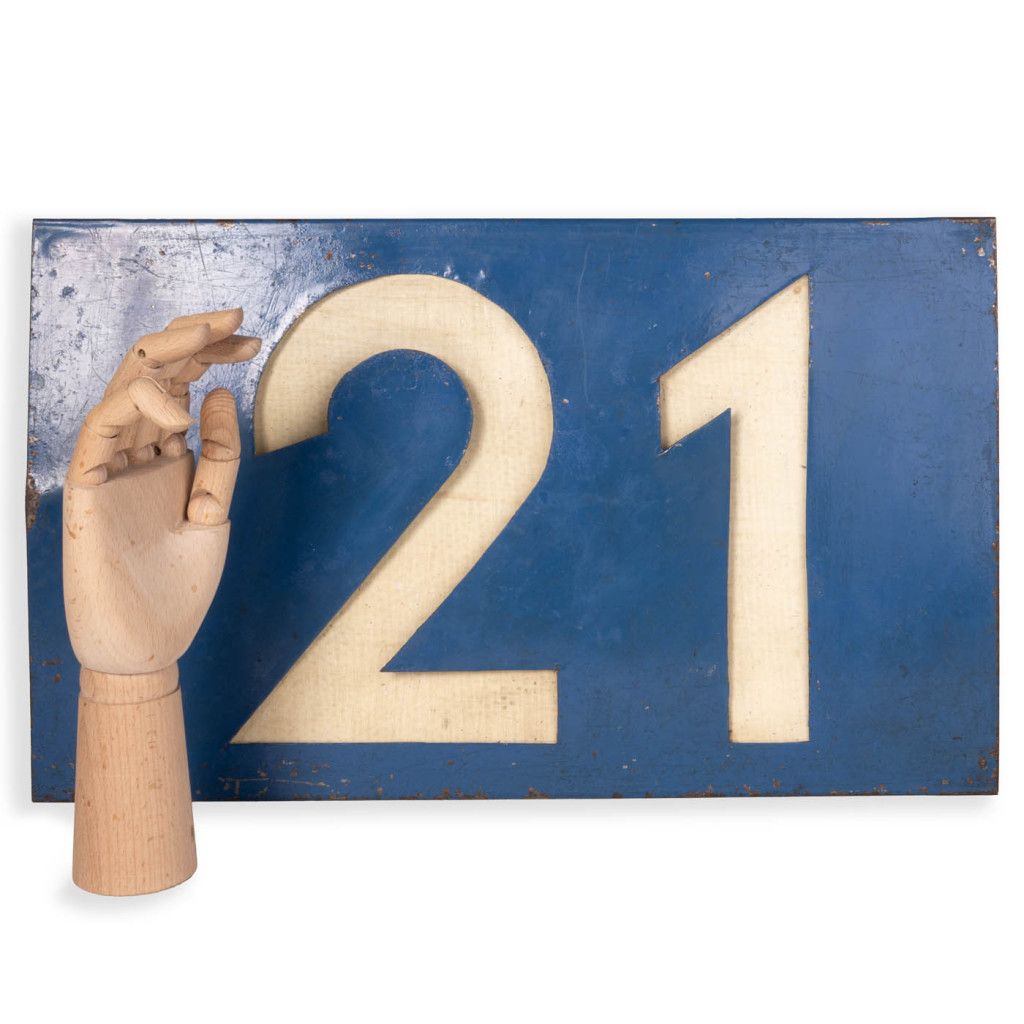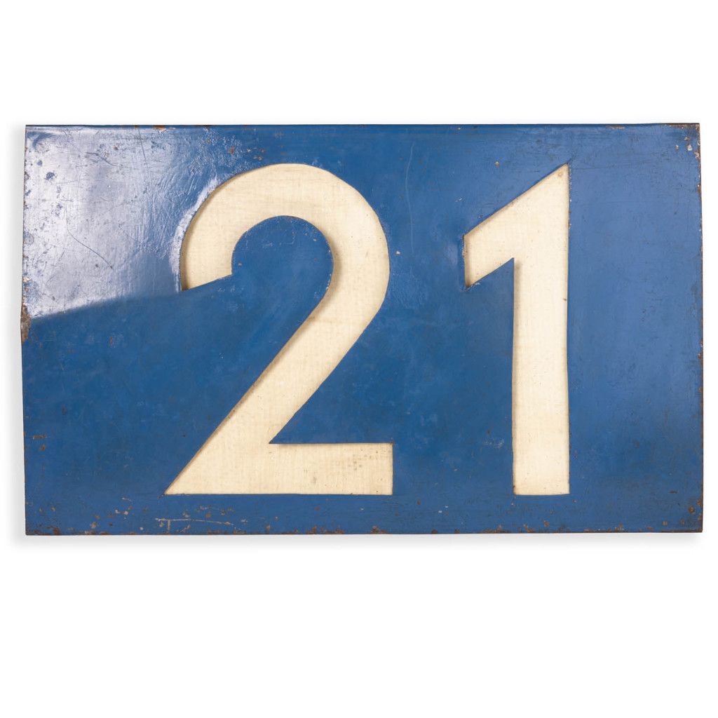 Original sign from the old Czechoslovak tram line No. 21 from the 1980s. It is comprised of a light-coloured panel set into a blue metal plate with a cut-out for the number. The sign is in good original condition with a visible patina, as can be seen in the photos. The metal is slightly warped and has various scratches.