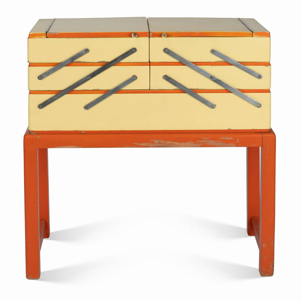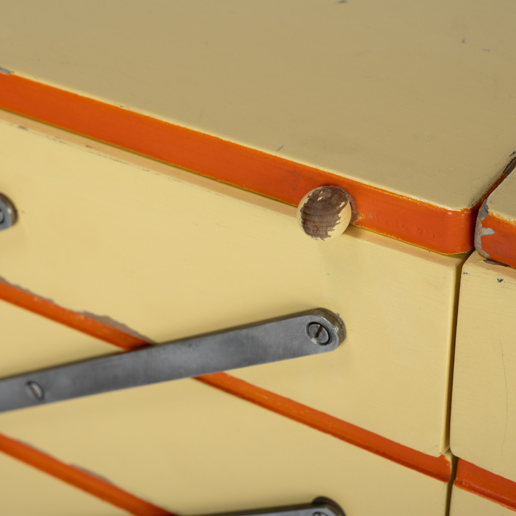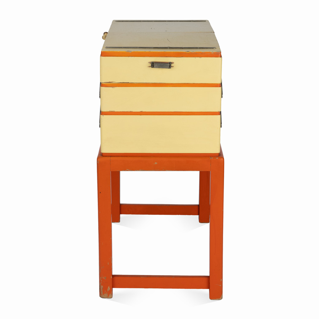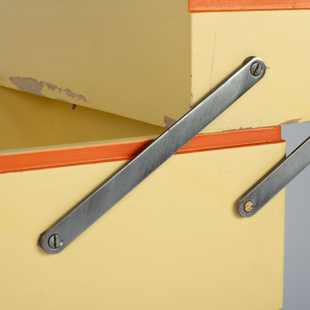 This original Art Deco sewing cabinet features a classic side-hinged mechanism and offers three levels of storage compartments. It is made from a combination of solid beech wood and plywood, and it stands on a solid steel structure with a deep orange enamel finish. The body of the cabinet is decorated with vanilla enamel and orange trim, and has metal hinges.