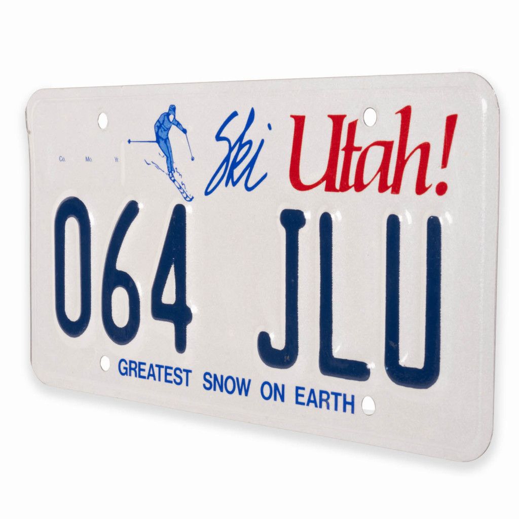 Collectible license plate from the U.S. state of Utah featuring the slogan “Ski Utah! Greatest Snow on Earth”. The first version of the plate was created in 1985 and, with various modifications, was produced until 2007. It references Utah’s rich skiing tradition. The plate is made of white-painted aluminum sheet with blue and red lettering. It is in very good original condition.