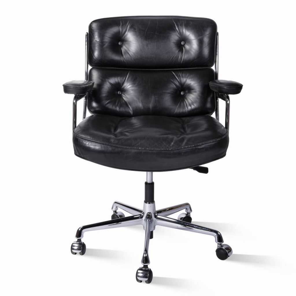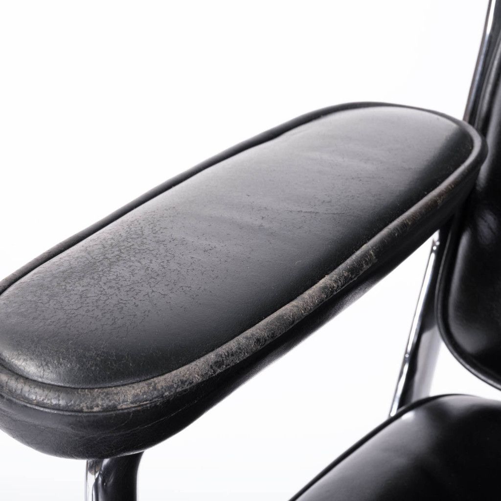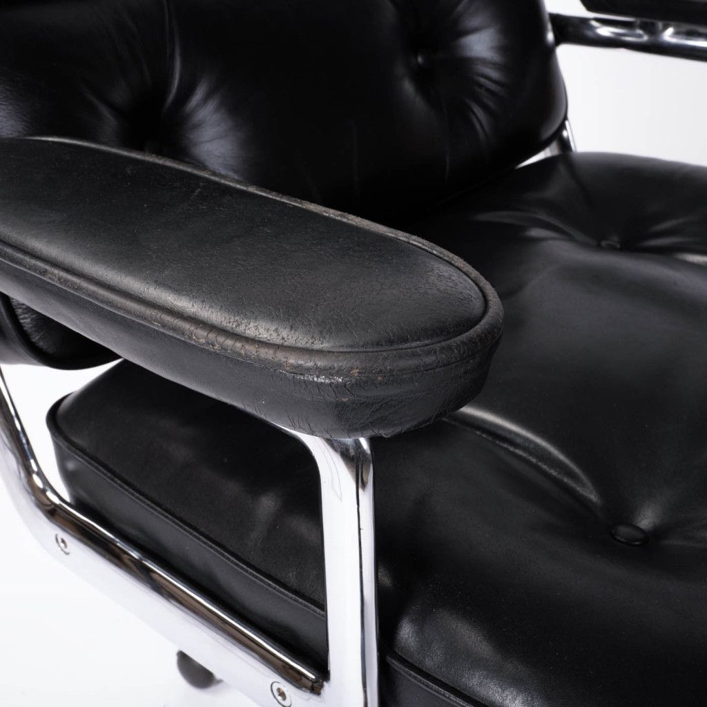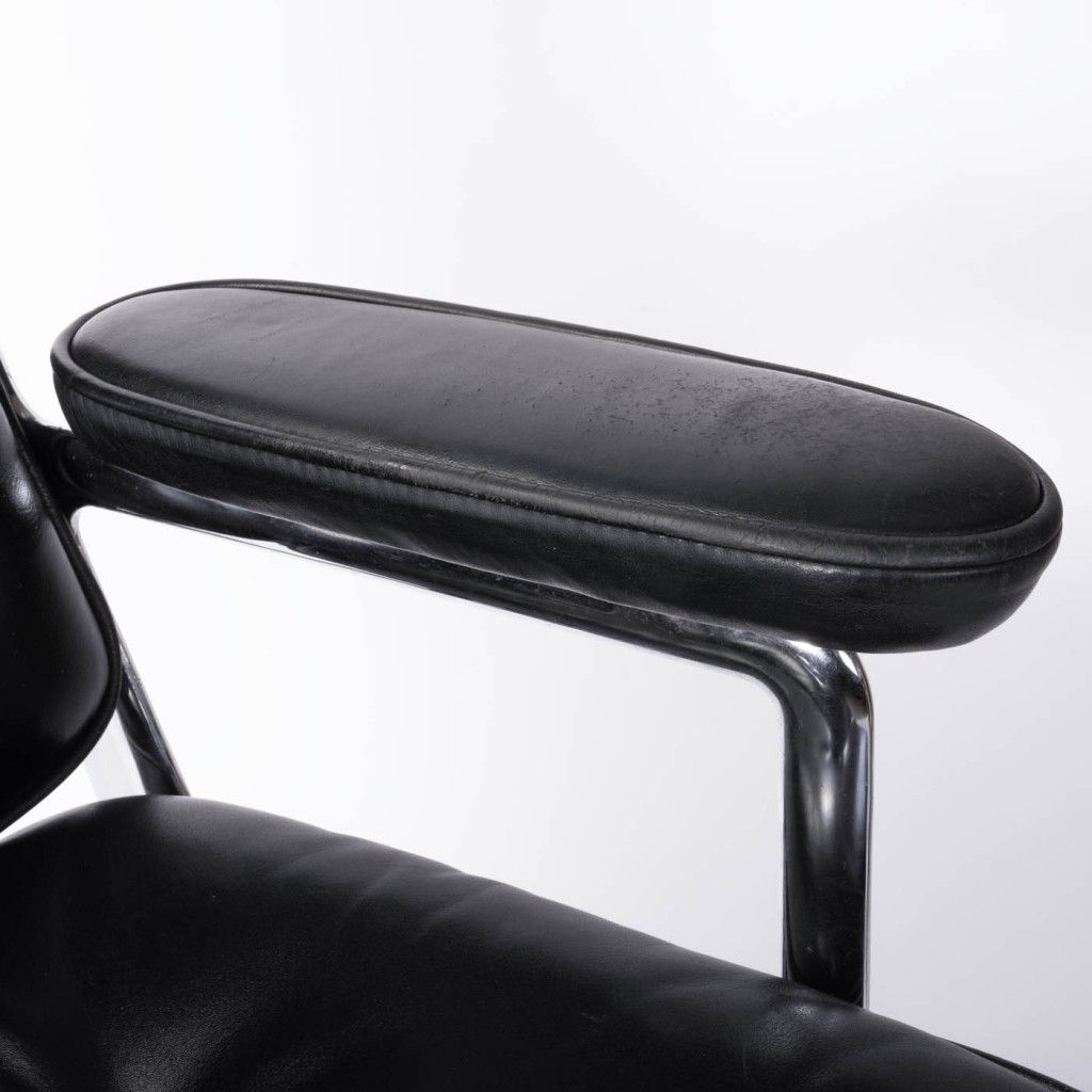 This specific chair was manufactured in 1984 according to the original design by the Swiss company Vitra, which holds the exclusive license to produce Eames furniture for the European market. The chair features a chromed aluminum structure consisting of a five-star base with casters and side frames that hold together three separate cushions upholstered in high-quality black leather with button tufting. The chair is exceptionally comfortable, features adjustable height, and has a tilt mechanism. It is in very good original condition. The armrests show a visible patina, and the leather is slightly scratched and scuffed in places. The chrome structure also bears minor scratches in some areas.