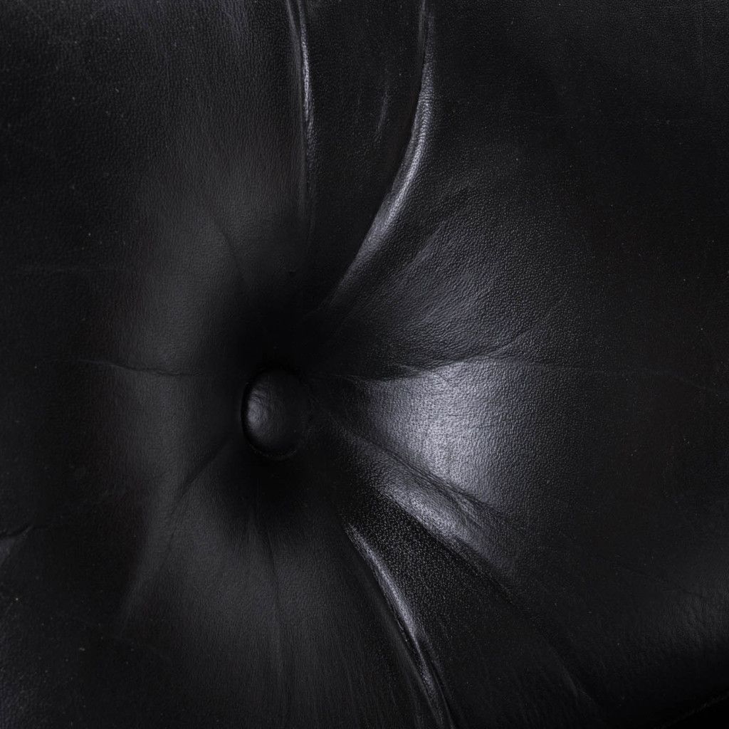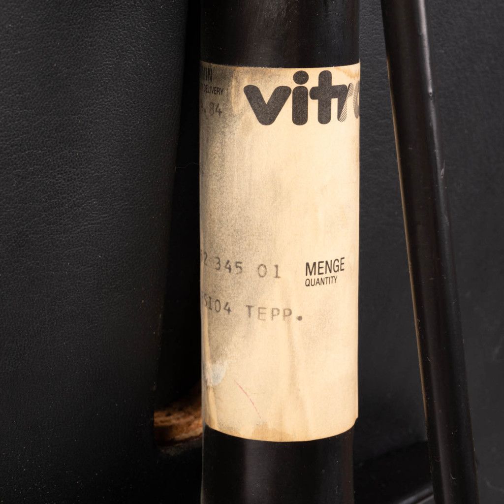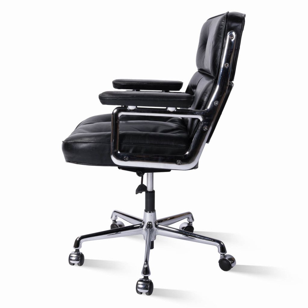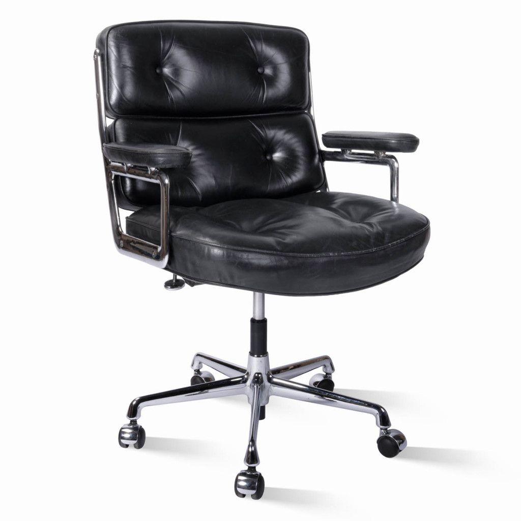This specific chair was manufactured in 1984 according to the original design by the Swiss company Vitra, which holds the exclusive license to produce Eames furniture for the European market. The chair features a chromed aluminum structure consisting of a five-star base with casters and side frames that hold together three separate cushions upholstered in high-quality black leather with button tufting. The chair is exceptionally comfortable, features adjustable height, and has a tilt mechanism. It is in very good original condition. The armrests show a visible patina, and the leather is slightly scratched and scuffed in places. The chrome structure also bears minor scratches in some areas.