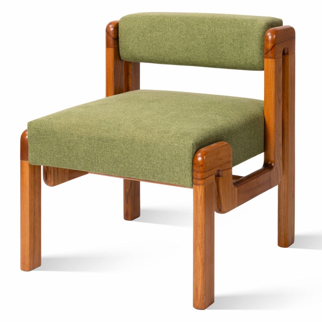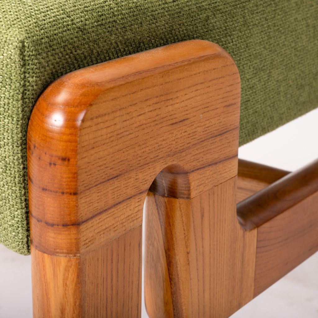 Low wooden armchair with an interesting geometric design, made from solid ash. The wood is stained a light brown shade with a matte finish. The seat and backrest have been reupholstered in pea green fabric. The armchair is in great condition after a complete renovation in our workshop. It forms a pair with a matching coffee table, which you can also find in our selection.
