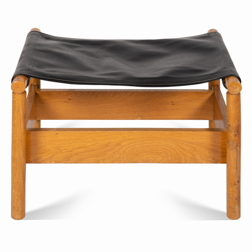Wooden footstool, probably from the 1960s. It has a solid beech wood frame covered with firm black leather.