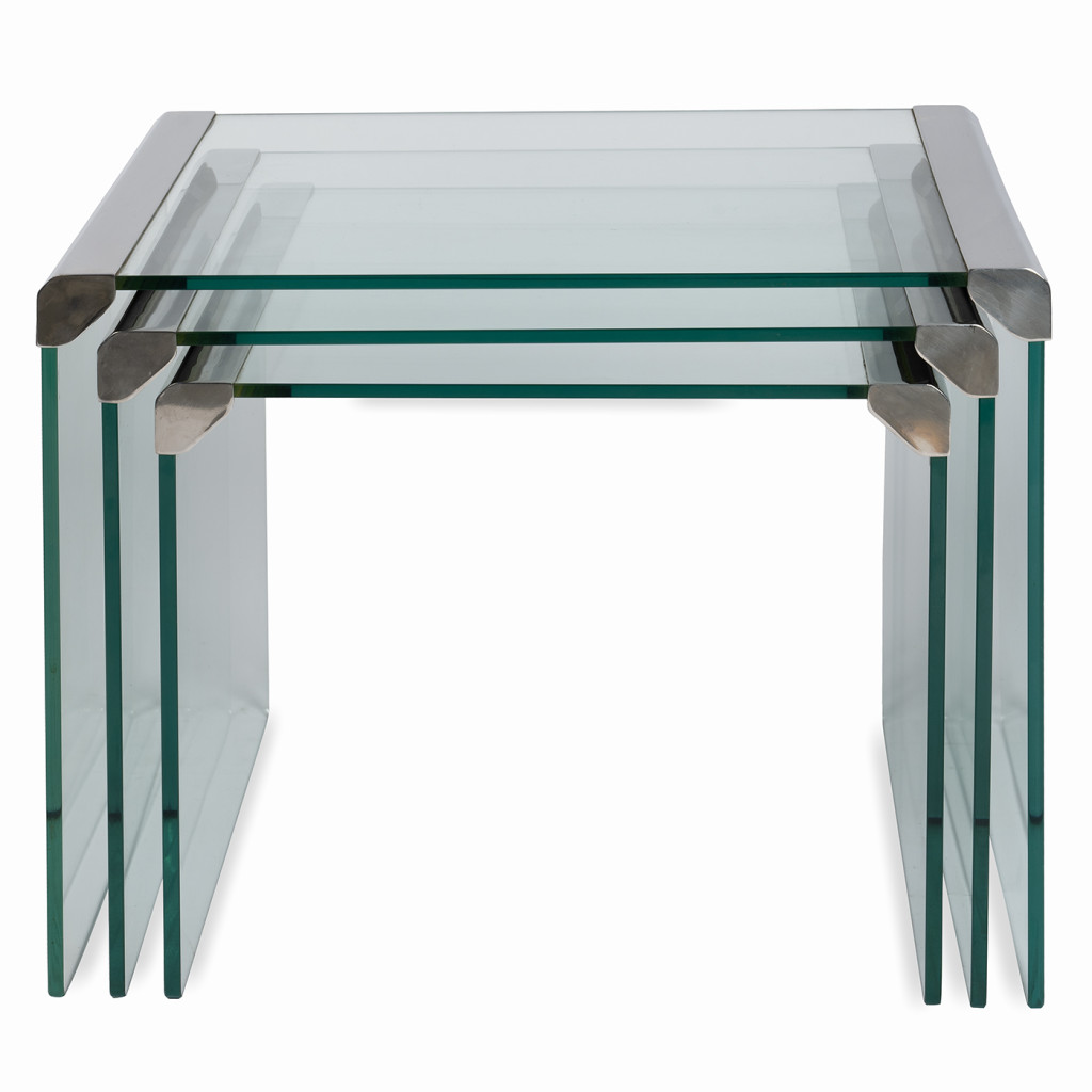 Sada tří hnízdových stolků, s označením T35, které pro svou vlastní značku Gallotti and Radice v sedmdesátých letech navrhl italský designér Pierangelo Gallotti. Stolky jsou vyrobeny ze skla a chromované oceli, charakteristických materiálů pro Gallottiho minimalistickou tvorbu. Stolky jsou ve vynikajícím původním stavu.