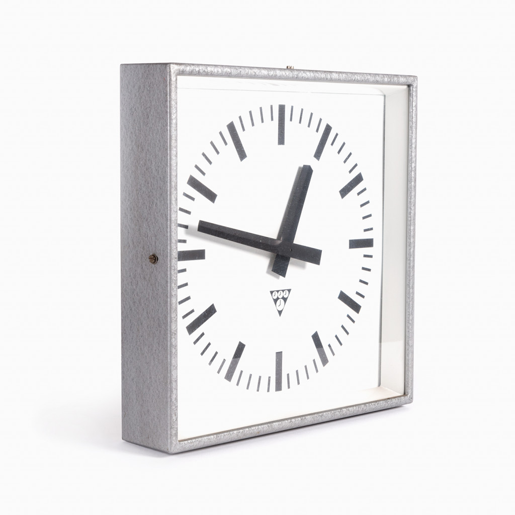 Původní průmyslové nástěnné hodiny Pragotron typu C 301 z 80. let. Hodiny jsou vybaveny ciferníkem s jednoduchým designem chráněným sklem. Rám hodin je zhotoven z plechu stříbrošedé barvy v původním stavu s patinou. Pokud chcete rám nově natřít kladívkovou barvou, tak nám prosím dejte vědět do poznámky při objednávce. Hodiny jsou přestavěné na bateriový strojek napájený 1 x AA baterií.