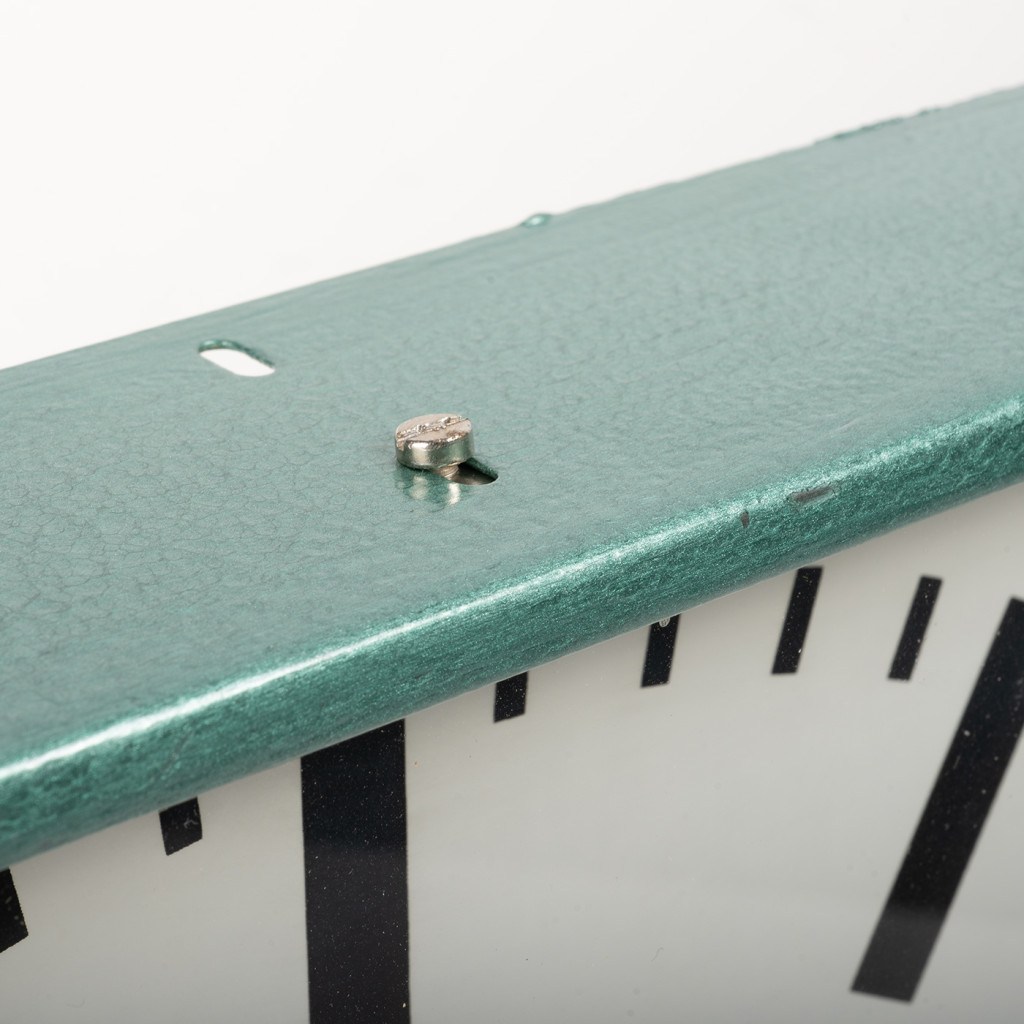 Rám hodin je z ocelového plechu natřeného tyrkysovou kladívkovou barvou.