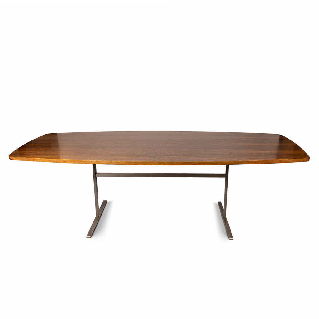 Veliký jídelní stůl ze sytě hnědé palisandrové dýhy natřený polomatným lakem. Stůl je výrazný svým elipsovitým tvarem a oblými hranami. Svrchní desku podpírá kovová konzole tvořená dvěma nohami z nerezové oceli, které jsou uprostřed přepažené ocelovou příčkou.