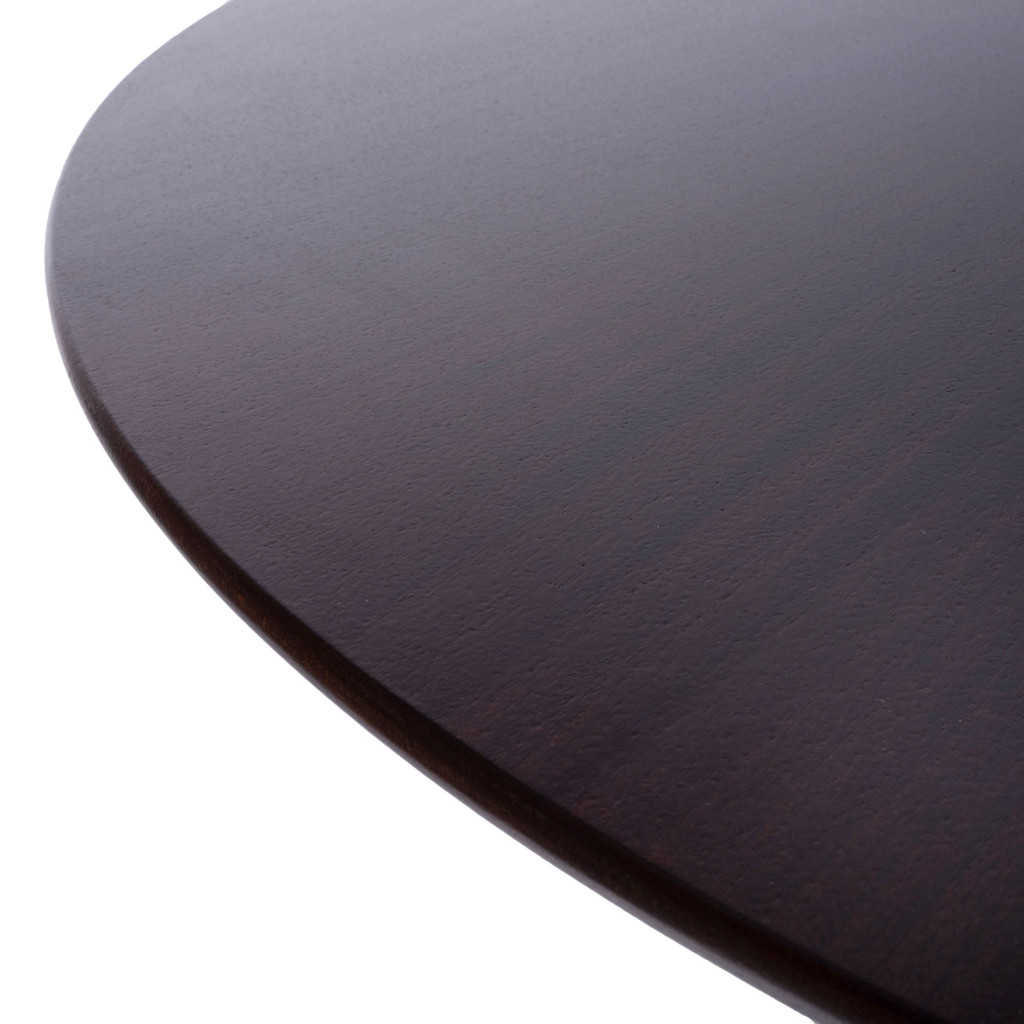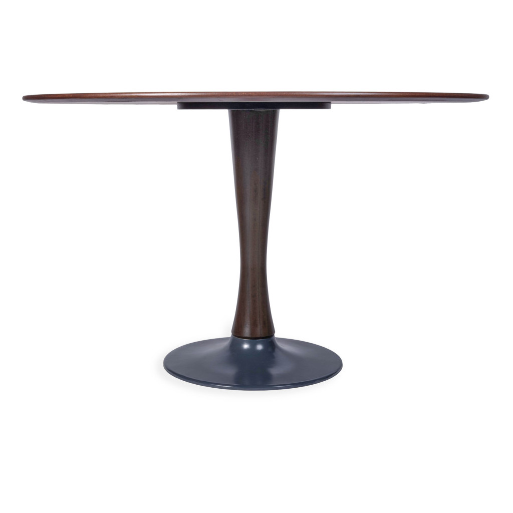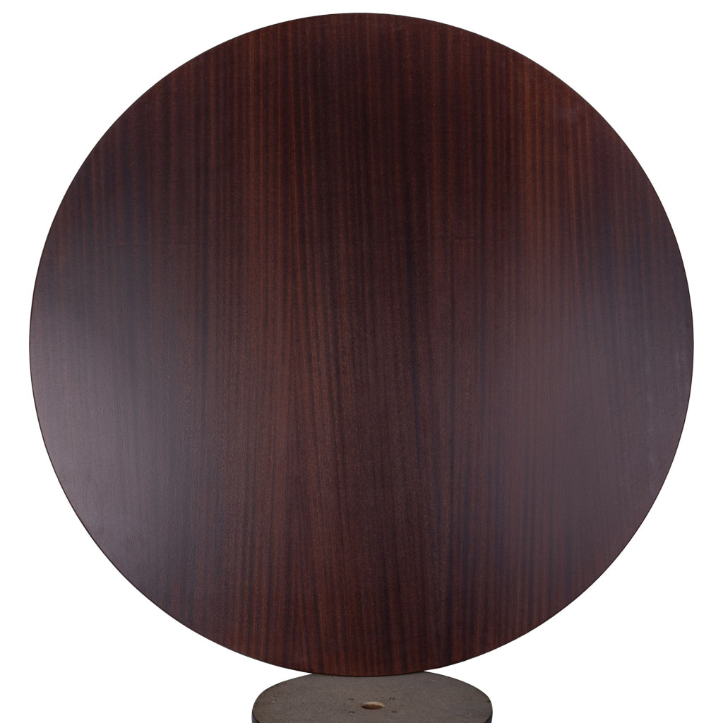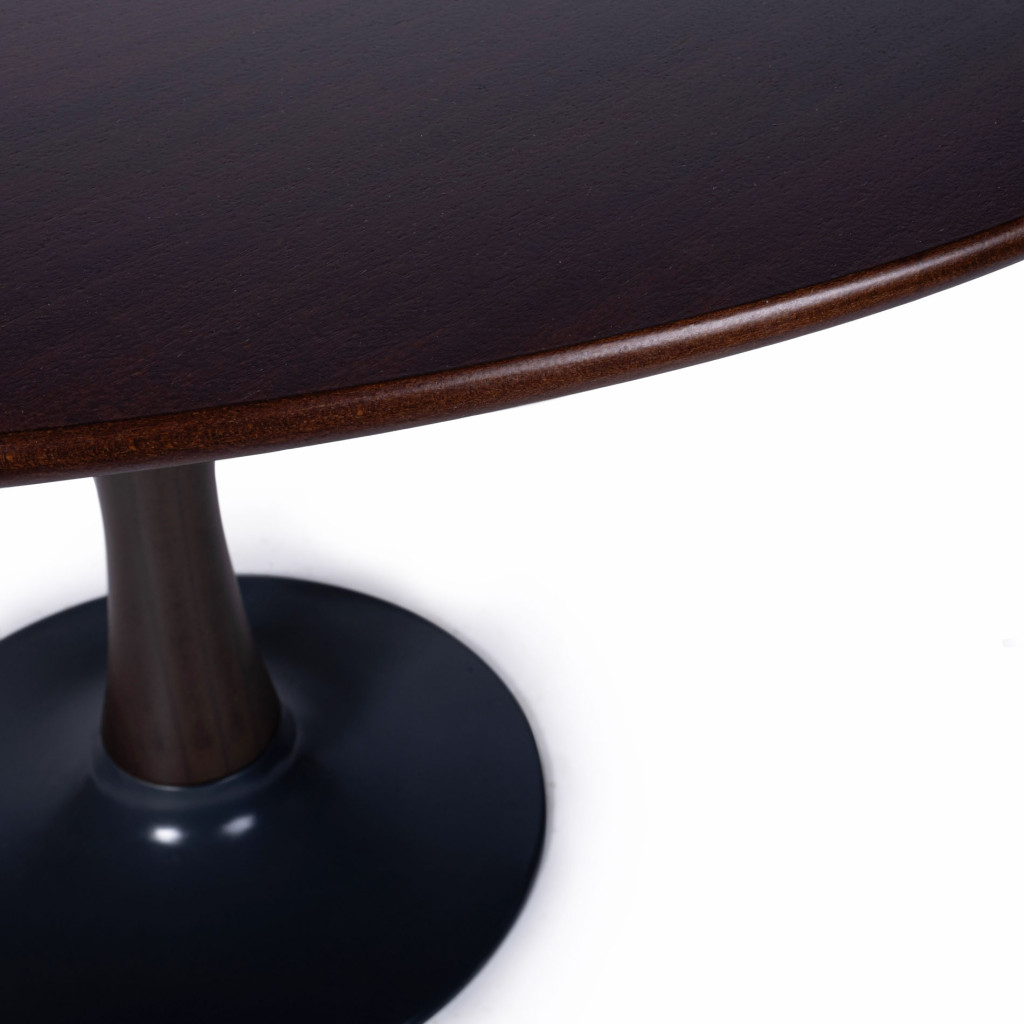 Dřevěný jídelní stůl vyrobený v 70. letech podnikem Dřevotvar Jablonné nad Orlicí. Výrobní družstvo Dřevotvar Jablonné nad Orlicí vyrábí nábytek již od roku 1951, kdy vzniklo spojením sedmnácti drobných řemeslníků a funguje dodnes. Stůl je vyroben z masivního bukového dřeva, stojí na tvarované dřevěné noze s kulatou kovovou základnou natřenou tmavě šedou barvou. Kruhová deska stolu je z MDF desky pokryté mahagonovou dýhou. Dřevo je mořeno do tmavě hnědého tónu v matném provedení. Stůl je ve skvělém stavu po kompletní renovaci v naší dílně.