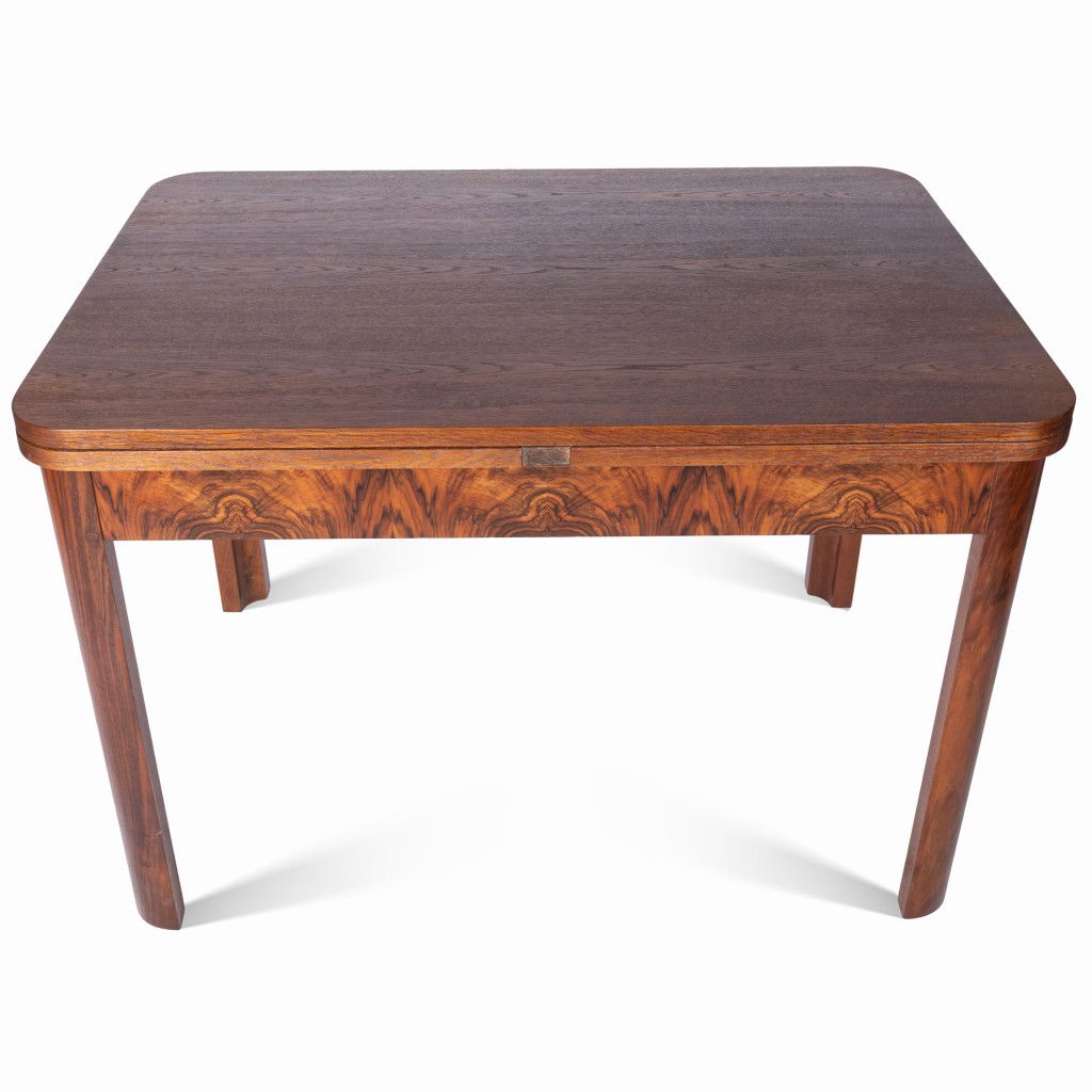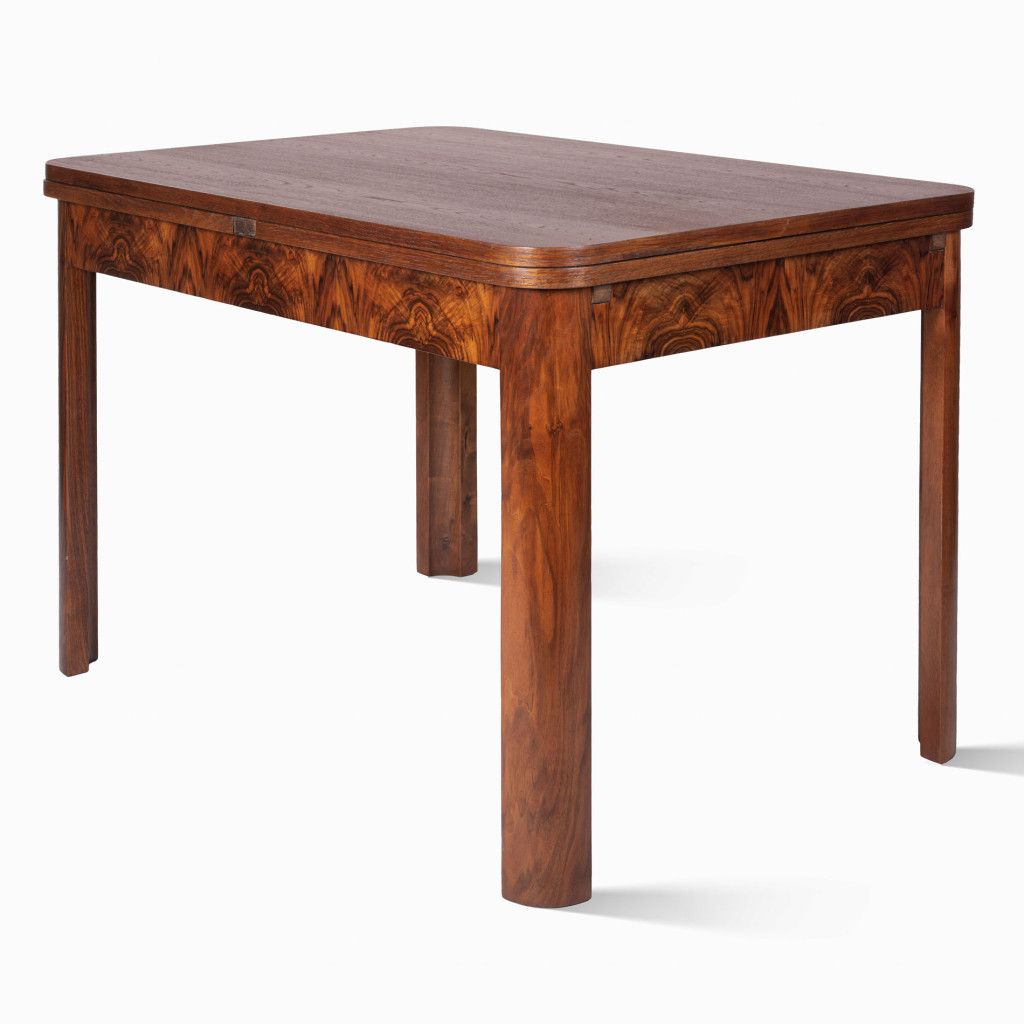 Rozkládací jídelní stůl vyrobil v 50. letech podnik UP závody podle návrhu Jindřicha Halabaly. Stůl je vyroben z ořechového masivu, buková konstrukce a dubová střední deska jsou potaženy ořechovou dýhou. Dřevo má výraznou dřevokresbu a je mořeno do sytě hnědého odstínu. Stůl je ve výborném stavu po kompletní renovaci v naší dílně.