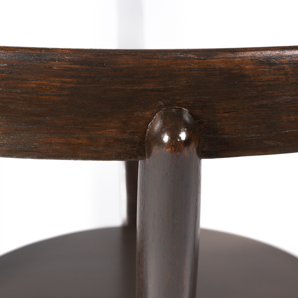 Konferenční stolek navržený v roce 1944 návrháři Antonínem Kropáčkem a Karlem Koželkou pro České umělecké dílny. Ke stolku bylo navrženo křeslo a celá tato kolekce byla o dva roky později oceněna stříbrnou medailí na milánském Trienále. Stolek se vyráběl ve světlé a tmavé variantě. Zde nabízíme tmavou variantu vyrobenou v národním podniku Interier Praha. Stolek je vyroben z masivního dřeva, obruč objímající skleněnou desku byla vyrobena z bukového dřeva technikou ohýbání, dřevo je namořeno do tmavého odstínu. Stolek je ve skvělém stavu po kompletní renovaci.