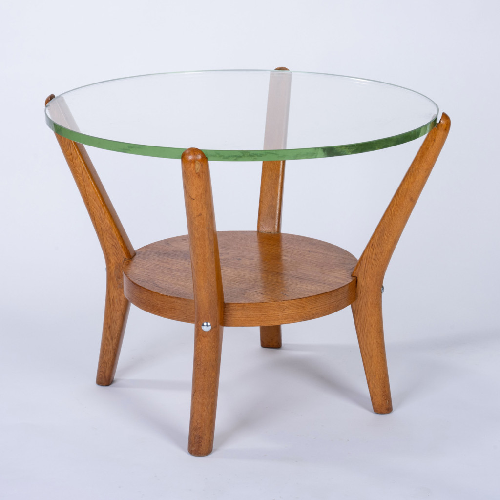 Kulatý konferenční stolek s vzdušnou konstrukcí z bukového dřeva a dubové dýhy. Horní desku tvoří silné sklo doplněné praktickým spodním patrem. Stolek má neoriginální šrouby a na okraji skleněné desky je cca 2 cm odštípnutý kousek, jinak je konstrukčně velmi pevný a zachovalý.