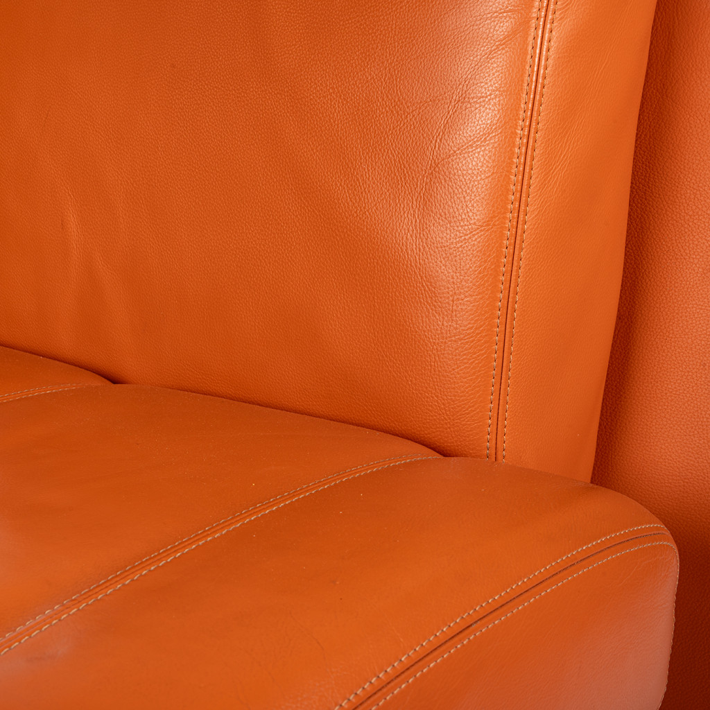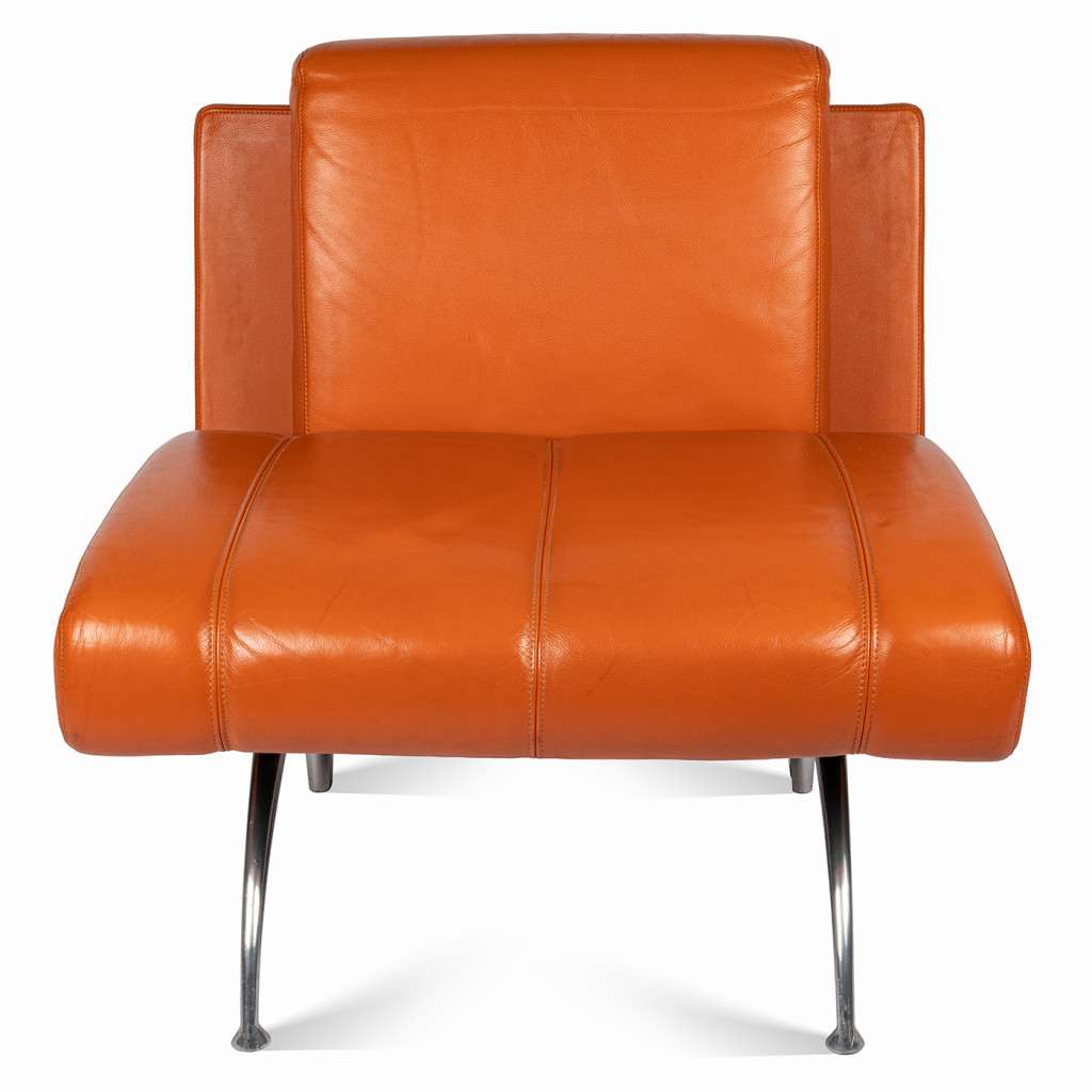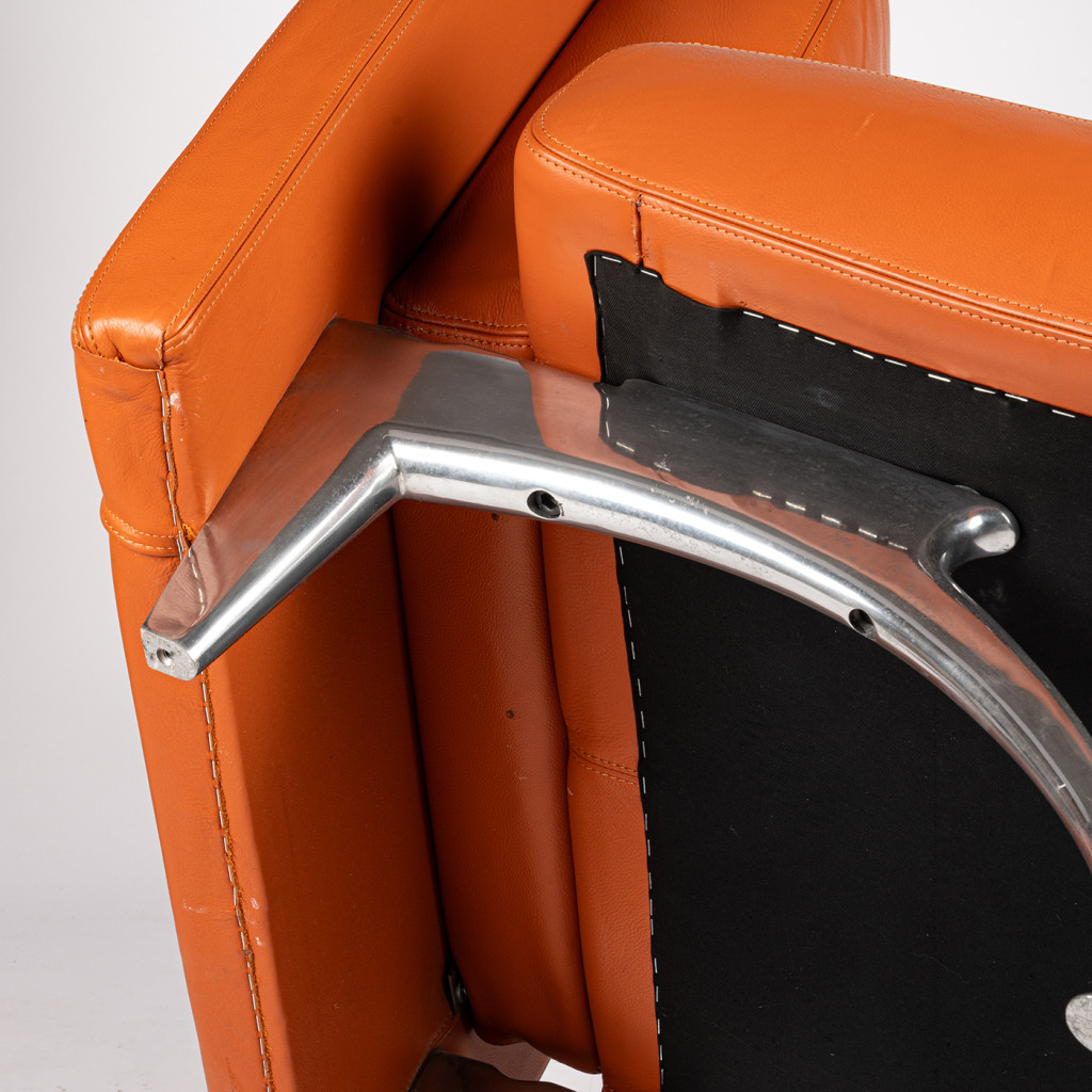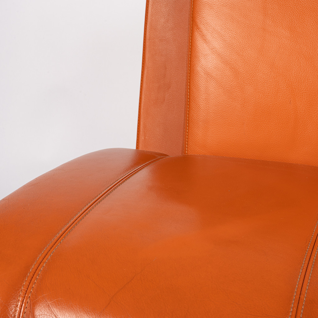 Křeslo stojí na čtyřech tenkých nožkách z chromované oceli spojených obloukovou příčkou. Tělo křesla tvoří robustní pevná obdélníková záda, menší opěradlo a podlouhlý sedák, vše polstrované měkkou prošívanou kůží v sytě oranžovém odstínu. Křeslo je ponecháno ve skvělém původním stavu, má pevnou konstrukci a bylo důkladně vyčištěno. Kožené polstrování má místy drobné flíčky a kovová podnož je lehce poškrábaná, jak je viditelné na fotografiích.