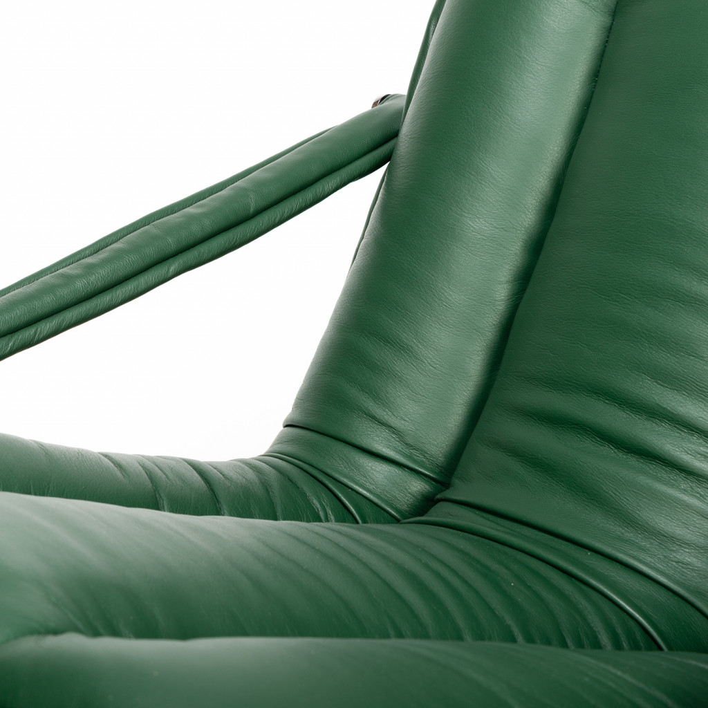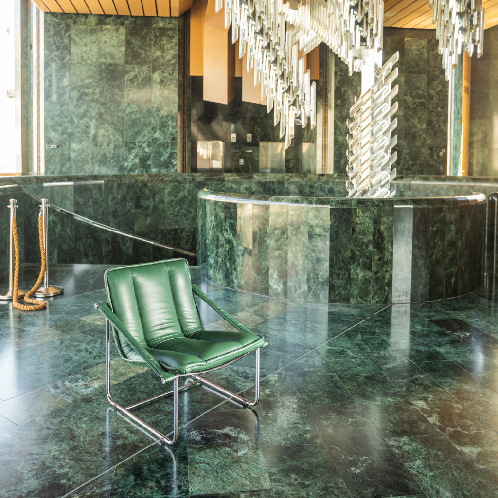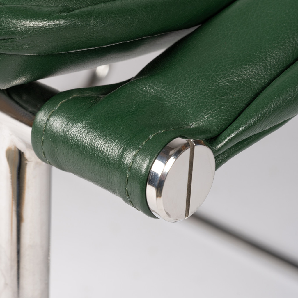 Tato replika křesla má kovový chromovaný rám a kožené čalounění. Tento specifický design byl vyroben pouze pro Novou scénu Národního divadla.