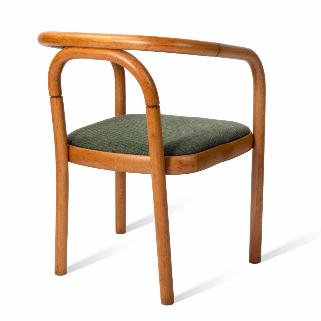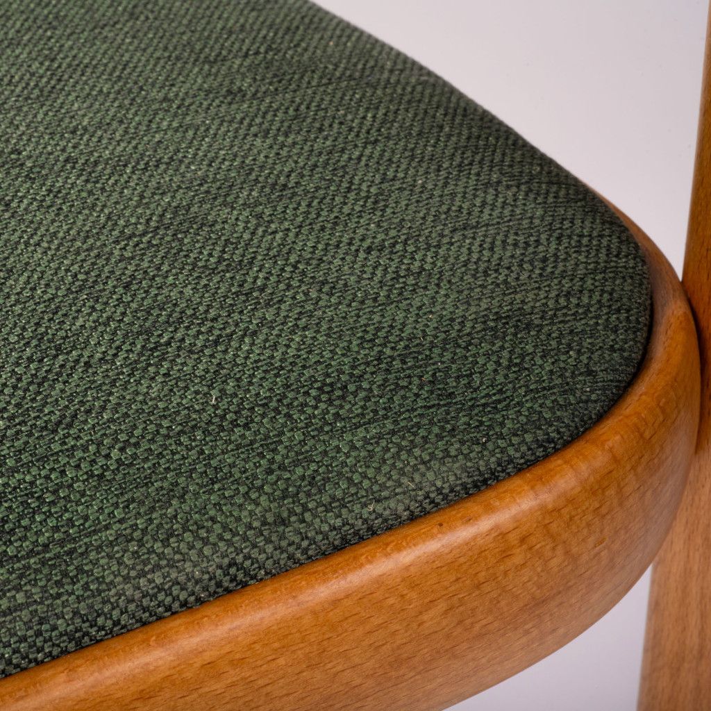 Křeslo má konstrukci z nastaveného ohýbaného bukového dřeva mořeného do světle hnědého odstínu v matném provedení. Polstrovaný sedák je nově potažený tmavě zelenou látkou. Křeslo je ve skvělém stavu po kompletní renovaci v naší dílně.