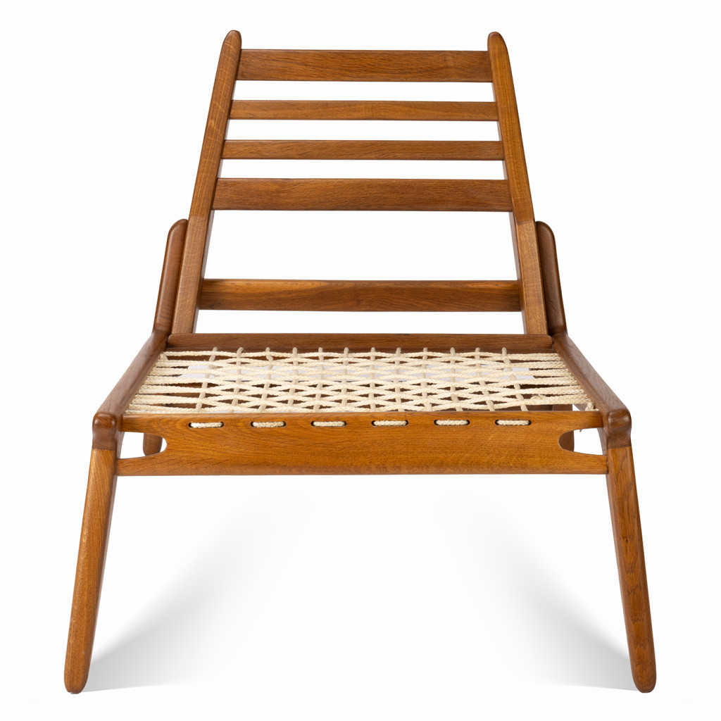 Dřevěné křeslo od východoněmeckého výrobce nábytku VEB möbelwerk Naumburg. Nízké, odpočinkové křeslo má konstrukci z dubového masivního dřeva, sedák je vypletený silným provazem, opěrka křesla je vyztužena příčnými laťkami.