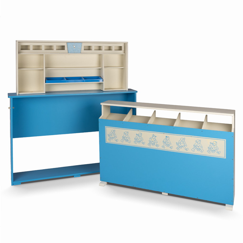Dřevěný pult je zhotovený ze smrkového masivu, polotvrdé dřevovláknité desky (MDF) a plastových prvků. Je natřený kombinací blankytně modré a krémové barvy a lze ho rozložit na dvě větší části. První, vyšší pult nese nástavbu s poličkami a hodinami. Druhý, nižší pult má přihrádky a je ozdoben pásem s obrázky dětí, které nakupují.