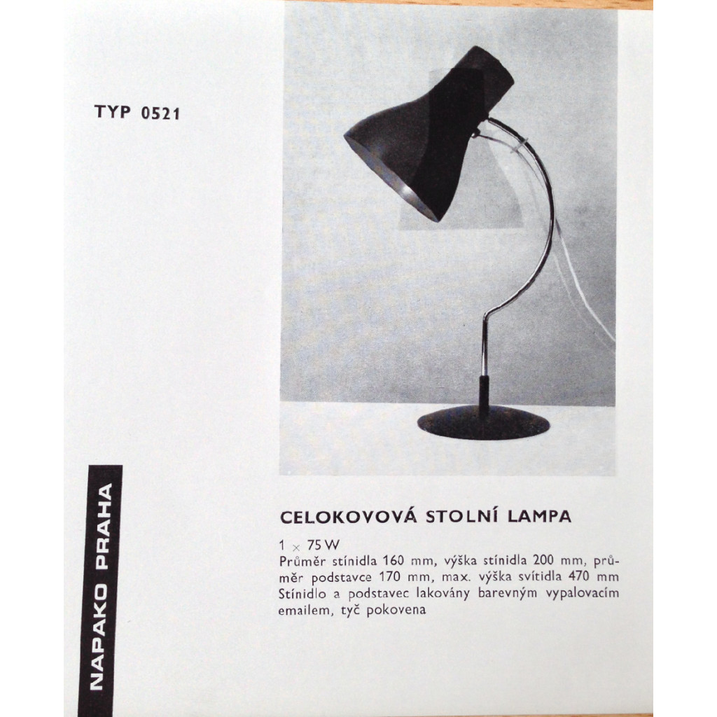 Metal table lamp marked 0521 produced by Napako in the seventies. Napako was founded in 1919 by a group of small private companies in Prague and the name was created by combining the first syllables of the words toolmaker, passers and metal printers. Since the 1940s, the name of designer Josef Hůrka has been inextricably linked with the company, creating designs for its most famous lamps, usually made of metal in bright colours. This dark orange version of the lamp has a metal shade supported by a chrome-plated rod and a dark orange base with light scratches. The lamp is fitted with an E27 bulb.