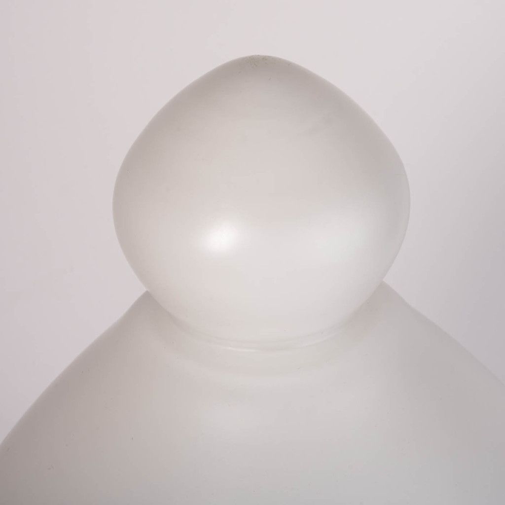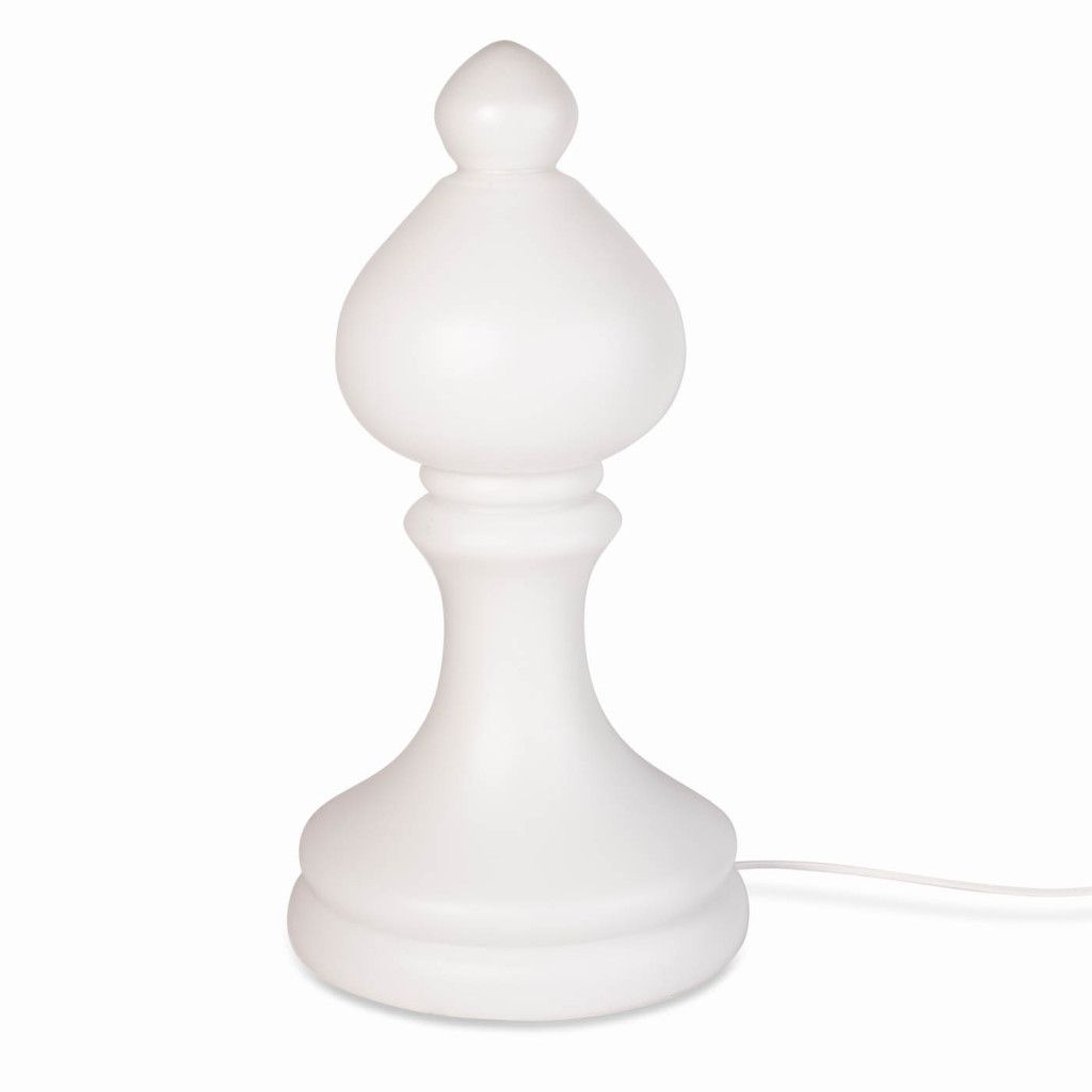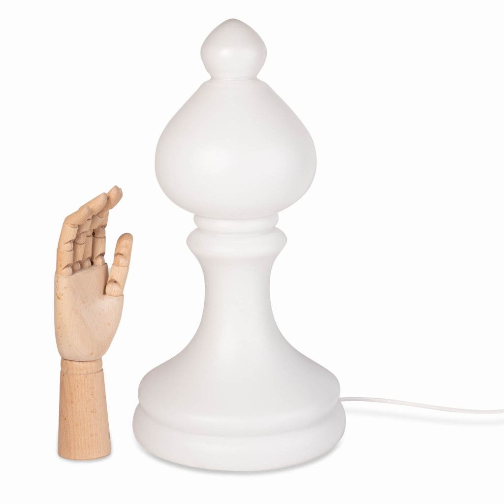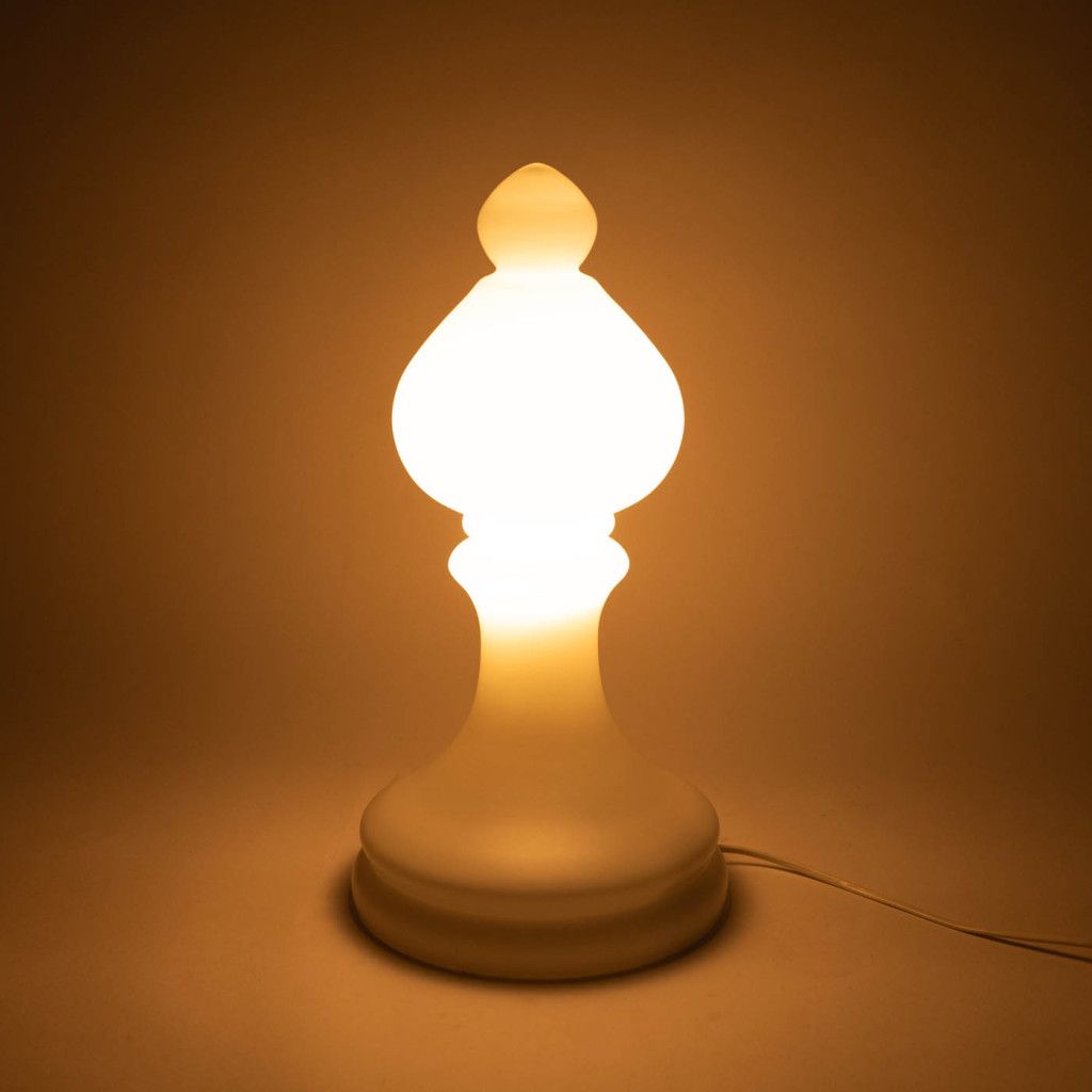 Celoskleněná lampa z matného bílého třívrstvého opakního skla ve tvaru šachové figurky střelce, kterou na začátku 70. let pro n.p. Osvětlovací sklo ve Valašském Meziříčí navrhl výtvarník Ivan Jakeš. Jeho návrhy jsou charakteristické jednoduchostí a čistými liniemi. Lampy šachových figurek patří k jeho nejznámějším návrhům, vyráběly se v mnoha pestrých barvách a vyvážely do zahraničí. Tato lampa díky svému tlumenému rozptýlenému světlu vytváří velmi příjemnou atmosféru a více než obyčejná stolní lampa je to originální světelná dekorace. Oblíbená rekvizita filmových interiérů nemůže být nesprávným tahem, ať už jsou šachy vaší vášní nebo ne. Lampa je funkční, je ve velmi dobrém původním stavu a svítí na jednu žárovku typu E14. Drobné oděrky jsou vidět na fotografiích.