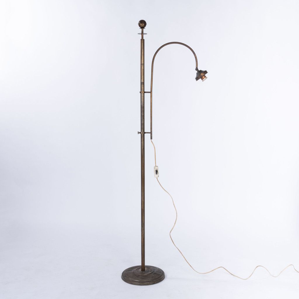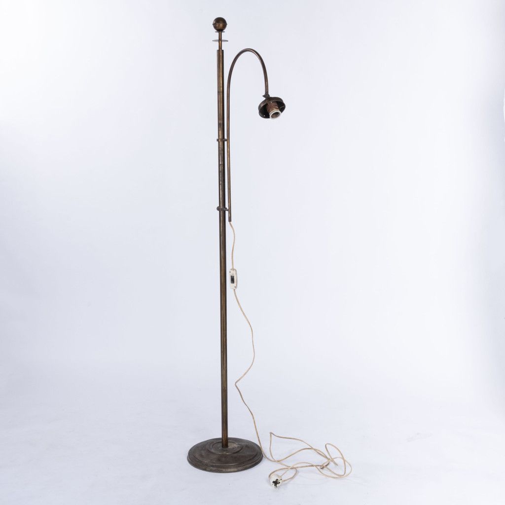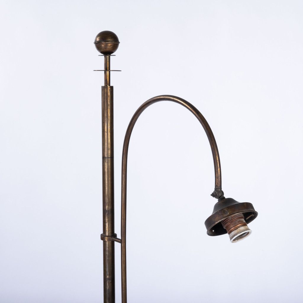 Mosazná stojací lampa s kovovou konstrukcí v původním stavu. Povrch nese známky používání v podobě odřené základny, škrábanců a místy patrné koroze. Celkově zachovalý kus s autentickou patinou materiálu.