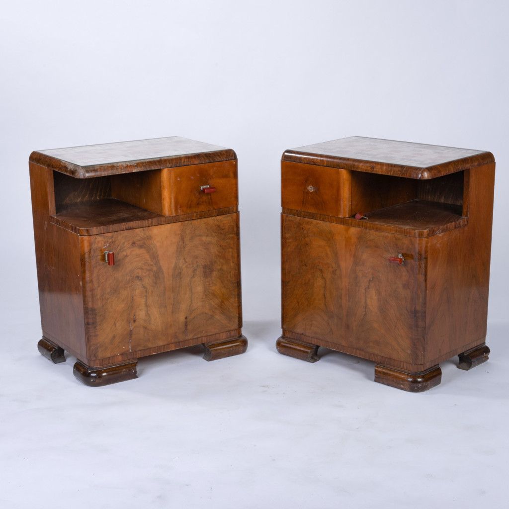 Dřevěný noční stolek s horní skleněnou deskou, pod kterou je vložená tkaná textilie. Korpus je zvenku opatřen ořechovou dýhou, vnitřní část tvoří kombinace buku a mahagonu. Zásuvka je doplněna madly z kovu a plastu. Na vnějším povrchu jsou patrné škrábance ve dřevě, jinak je stolek v dobrém a plně funkčním stavu.