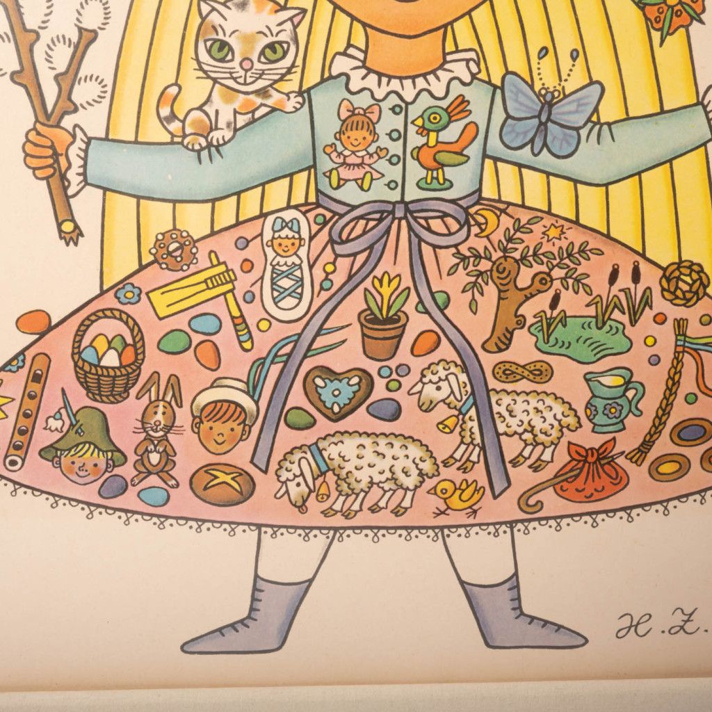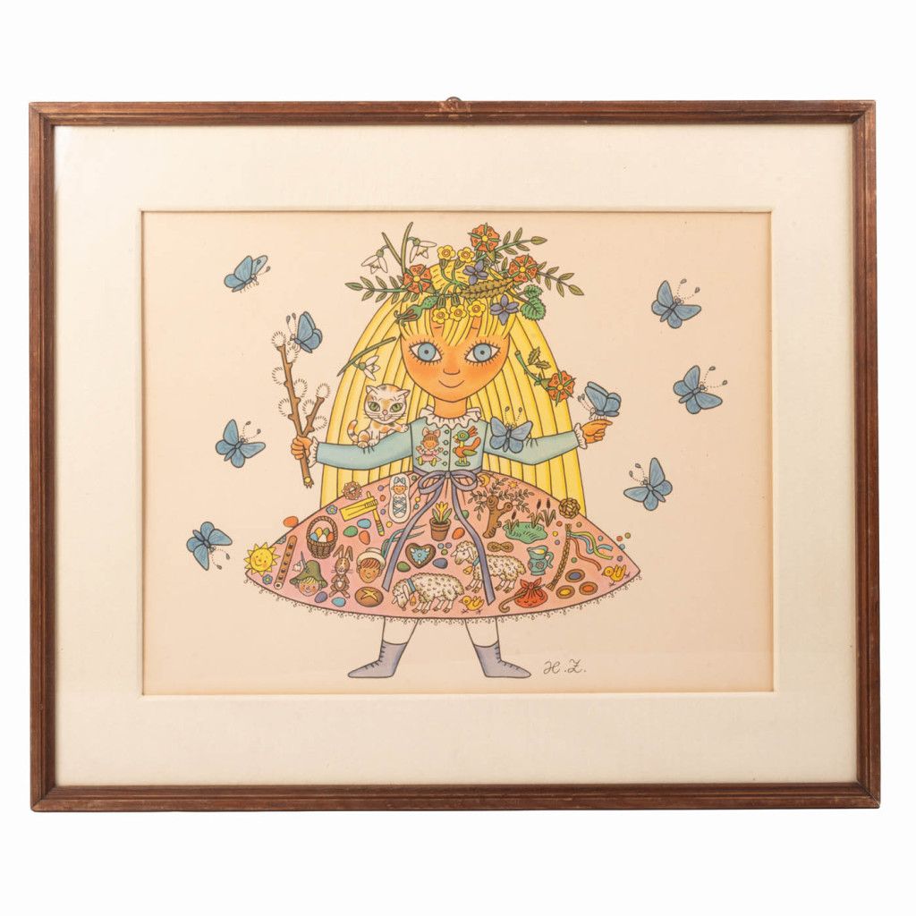 Originální grafika dívky jako alegorie jara od Heleny Zmatlíkové z roku 1968. Jaro tvoří součást obrázkového cyklu čtyř ročních období, které také najdete v naší nabídce. Tisk je zasklený v hnědém dřevěném rámu s krémovou paspartou a poutkem na zavěšení. Je ve velmi dobrém původním stavu. Rám je pouze mírně odřený a vzadu má natrženou fixační lepenku.