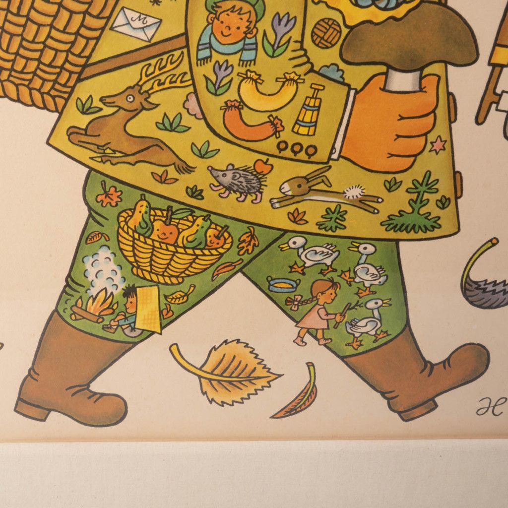 Originální grafika stařečka jako alegorie podzimu od Heleny Zmatlíkové z roku 1968. Podzim tvoří součást obrázkového cyklu čtyř ročních období, které také najdete v naší nabídce. Tisk je zasklený v hnědém dřevěném rámu s krémovou paspartou a poutkem na zavěšení. Je ve velmi dobrém původním stavu. Rám je pouze mírně odřený, vzadu má natrženou fixační lepenku a drobné stopy od pastelky a vody.