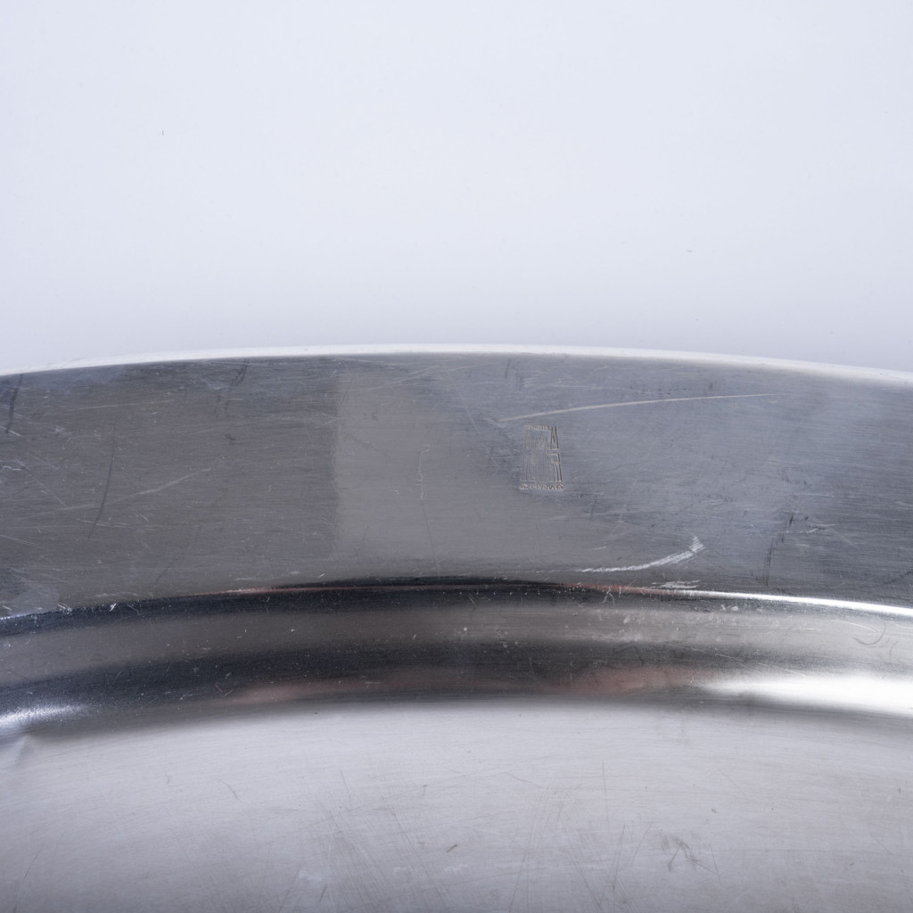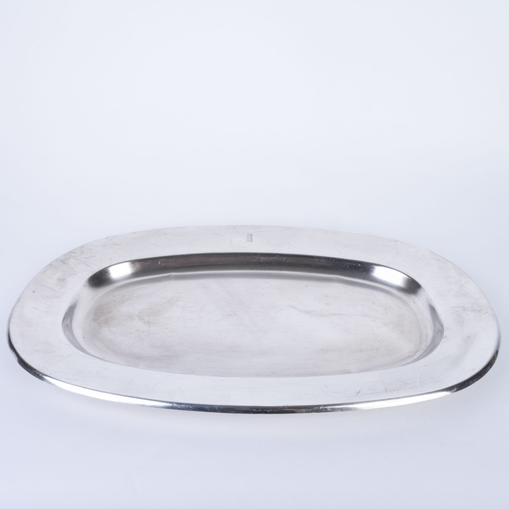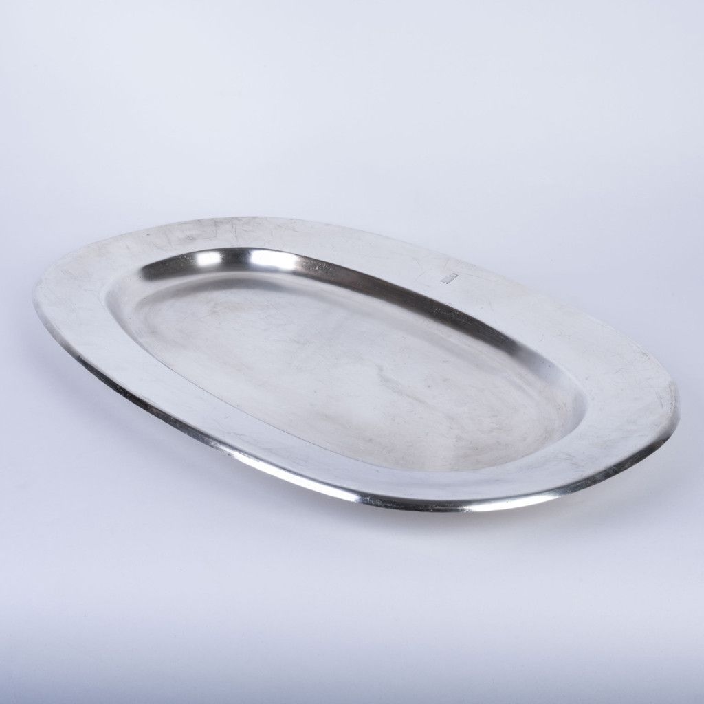 Hotel Praha byl naprostou špičkou mezi československými hotely. Šlo o nejluxusnější ubytovací zařízení postavené výhradně pro komunistickou stranu a její hosty a běžní obyvatelé do něj neměli přístup. Nám se podařilo při jeho bourání v roce 2014 zachránit několik jedinečných předmětů mezi které patří i tento oválný tác, vyrobený z bílé postříbřené mosazi (alpaka). Fotka je ilustrační, každý kus má lehce odlišnou patinu. Z důvodu stáří je každý kus na povrchu poničen poškrábáním, či korozí. Tác byl důkladně vyčištěn.