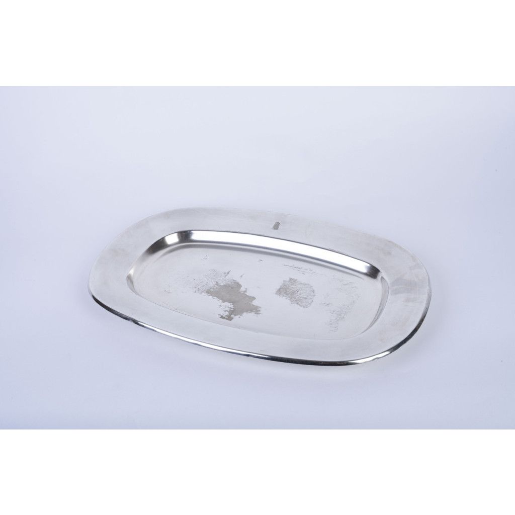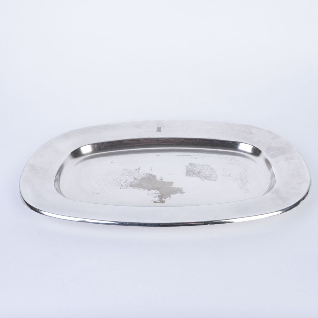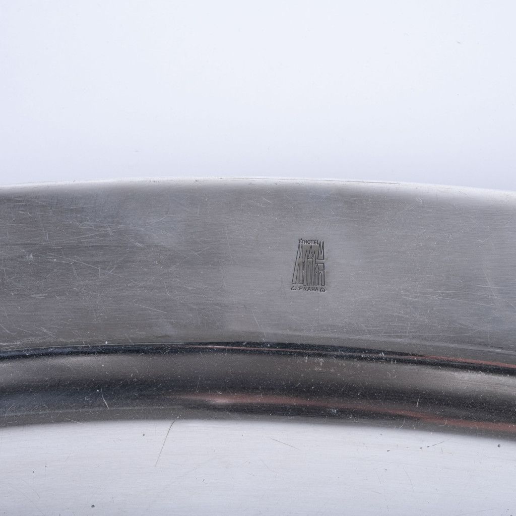 Hotel Praha byl naprostou špičkou mezi československými hotely. Šlo o nejluxusnější ubytovací zařízení postavené výhradně pro komunistickou stranu a její hosty a běžní obyvatelé do něj neměli přístup. Nám se podařilo při jeho bourání v roce 2014 zachránit několik jedinečných předmětů mezi které patří i tento oválný tác, vyrobený z bílé postříbřené mosazi (alpaka). Fotka je ilustrační, každý kus má lehce odlišnou patinu. Z důvodu stáří je každý kus na povrchu poničen poškrábáním, či korozí. Tác byl důkladně vyčištěn.