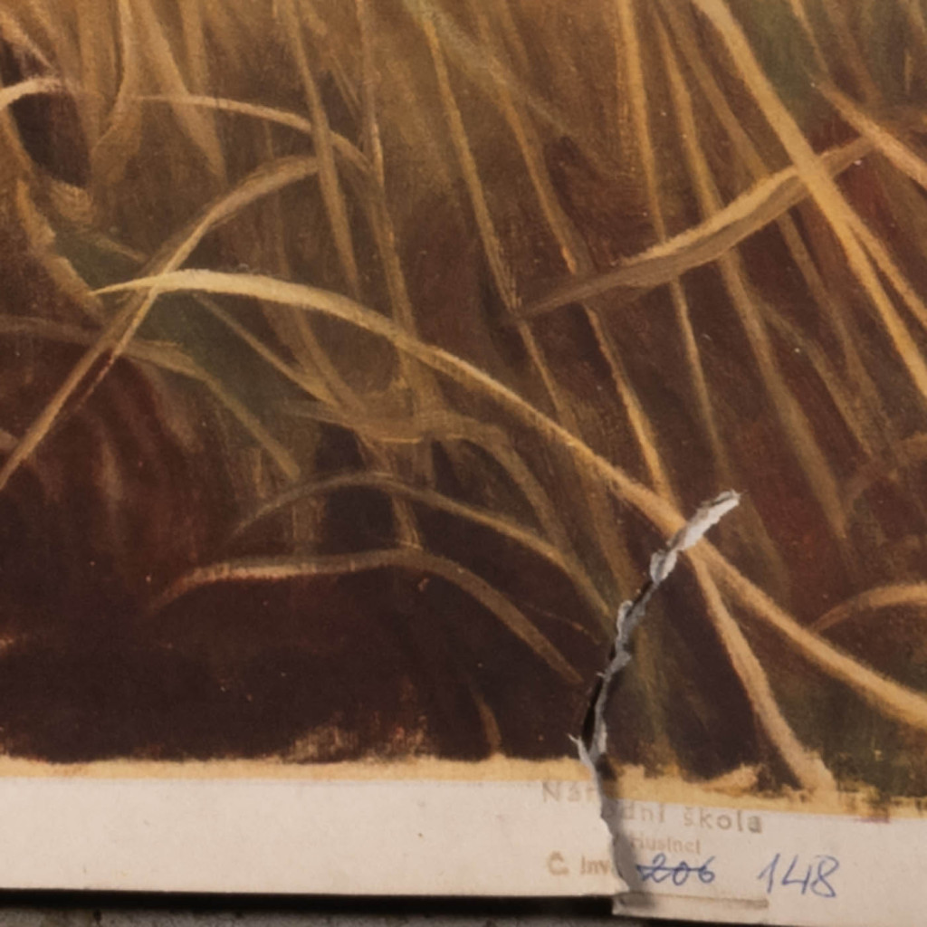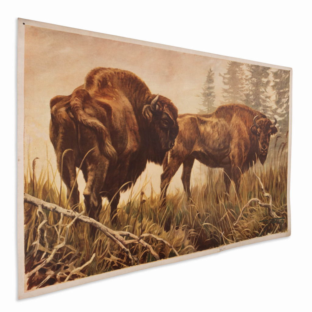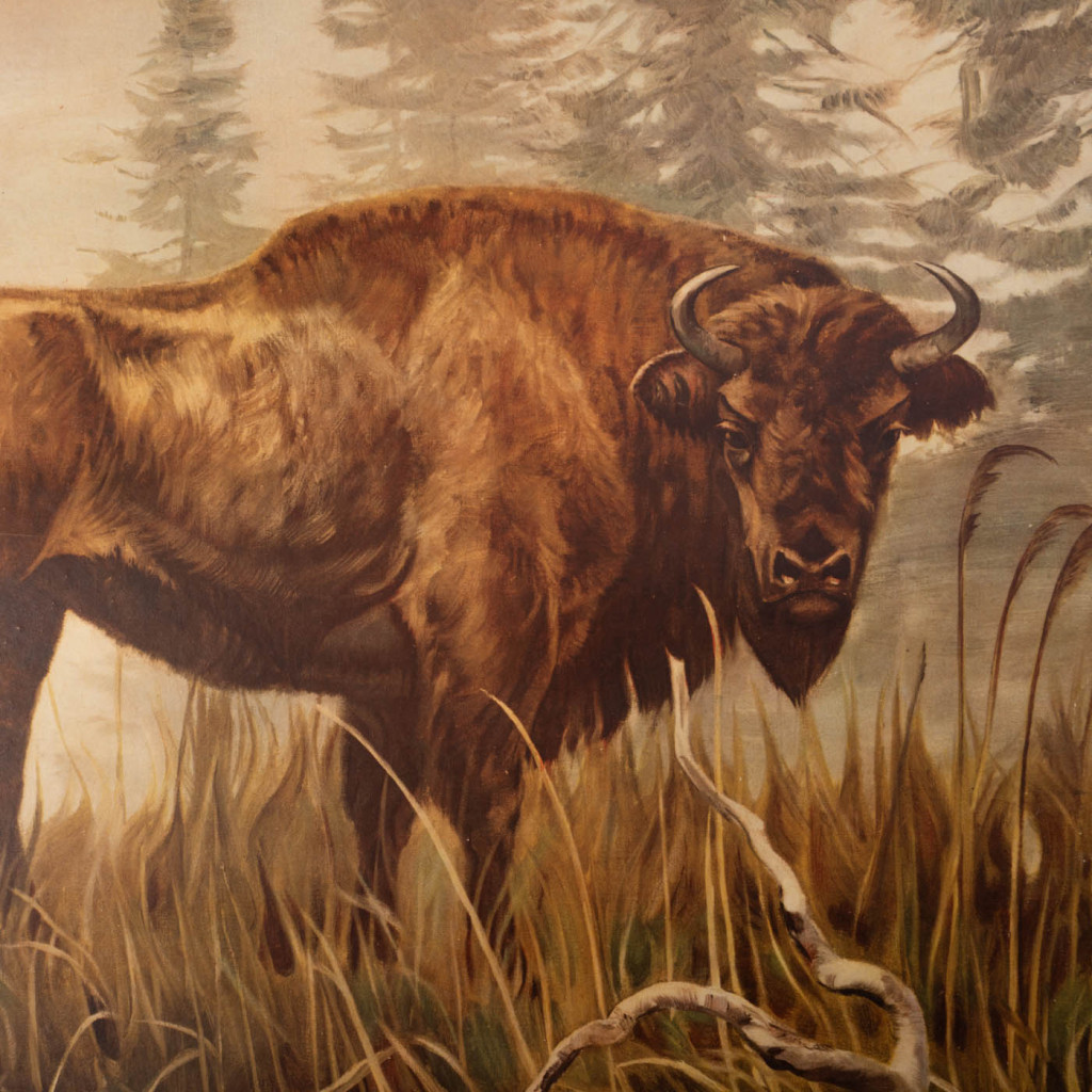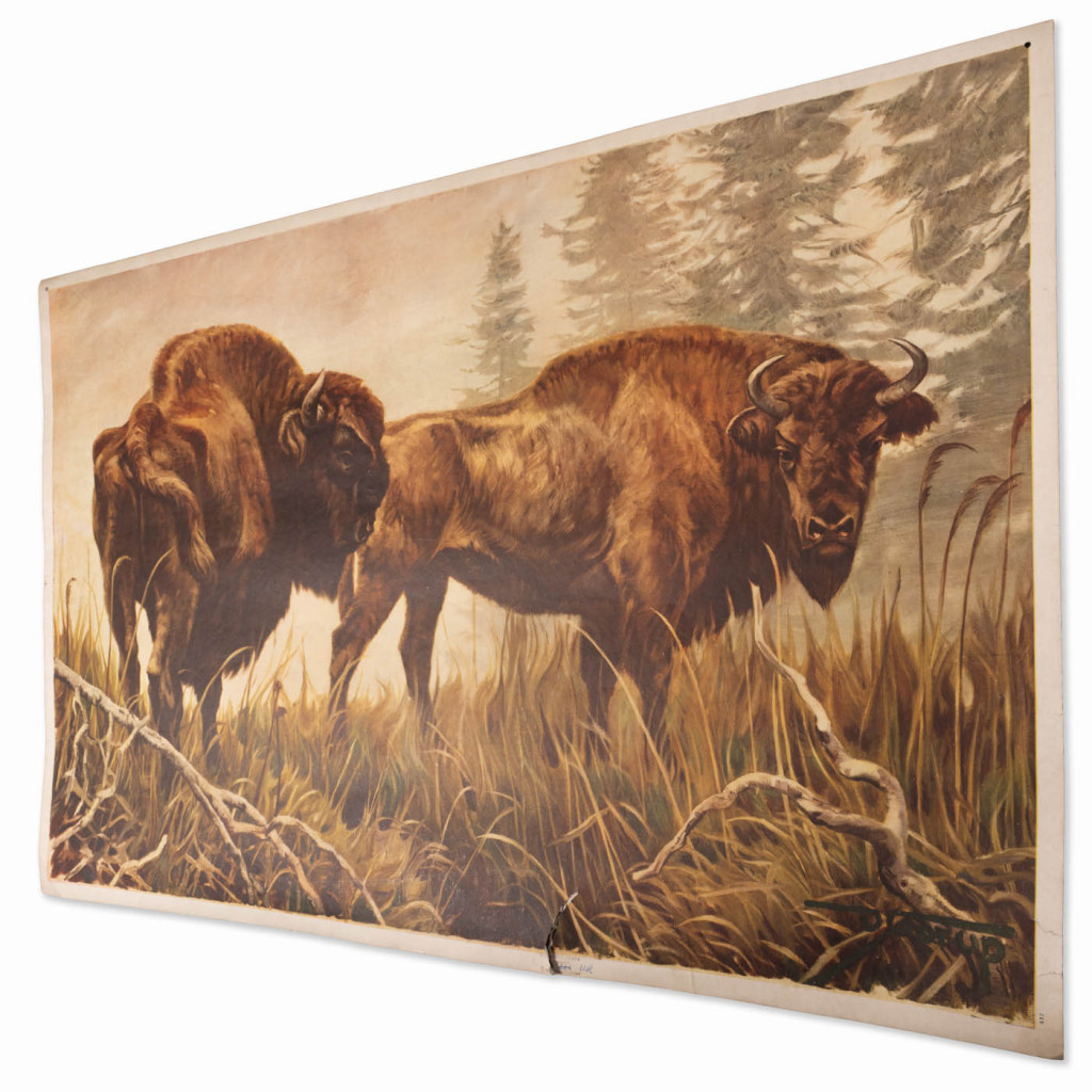 Krásný prvorepublikový školní plakát zobrazující dva zubry evropské neboli Bison bonasus na travnaté pláni. Jde o kolorovaný tisk z roku 1933 a pochází ze série České zoologické obrazy od malíře Janeze Mihaela Gorupa. Plakát je tištěný na tvrdém papíře. Je ve velmi dobrém původním stavu, papír je v jednom místě na spodní straně natržený.