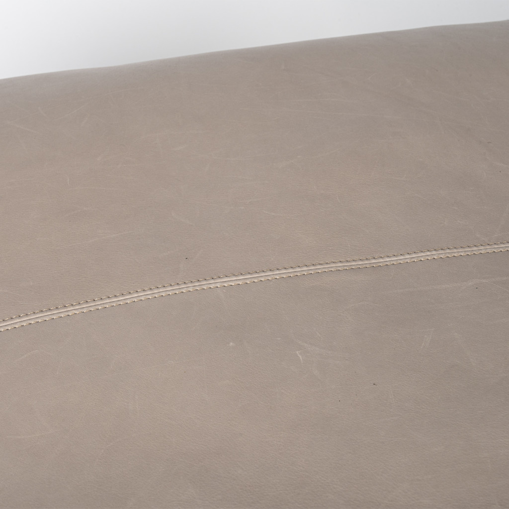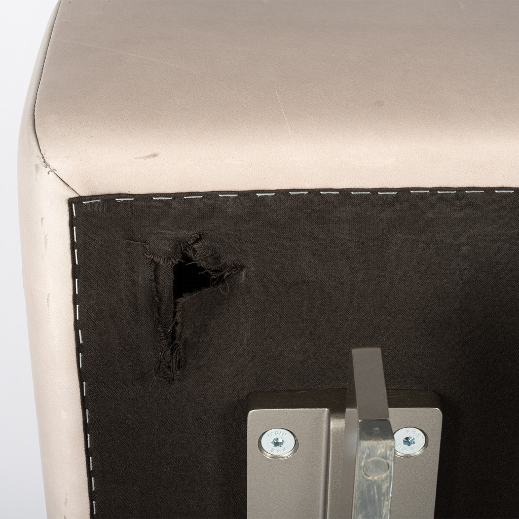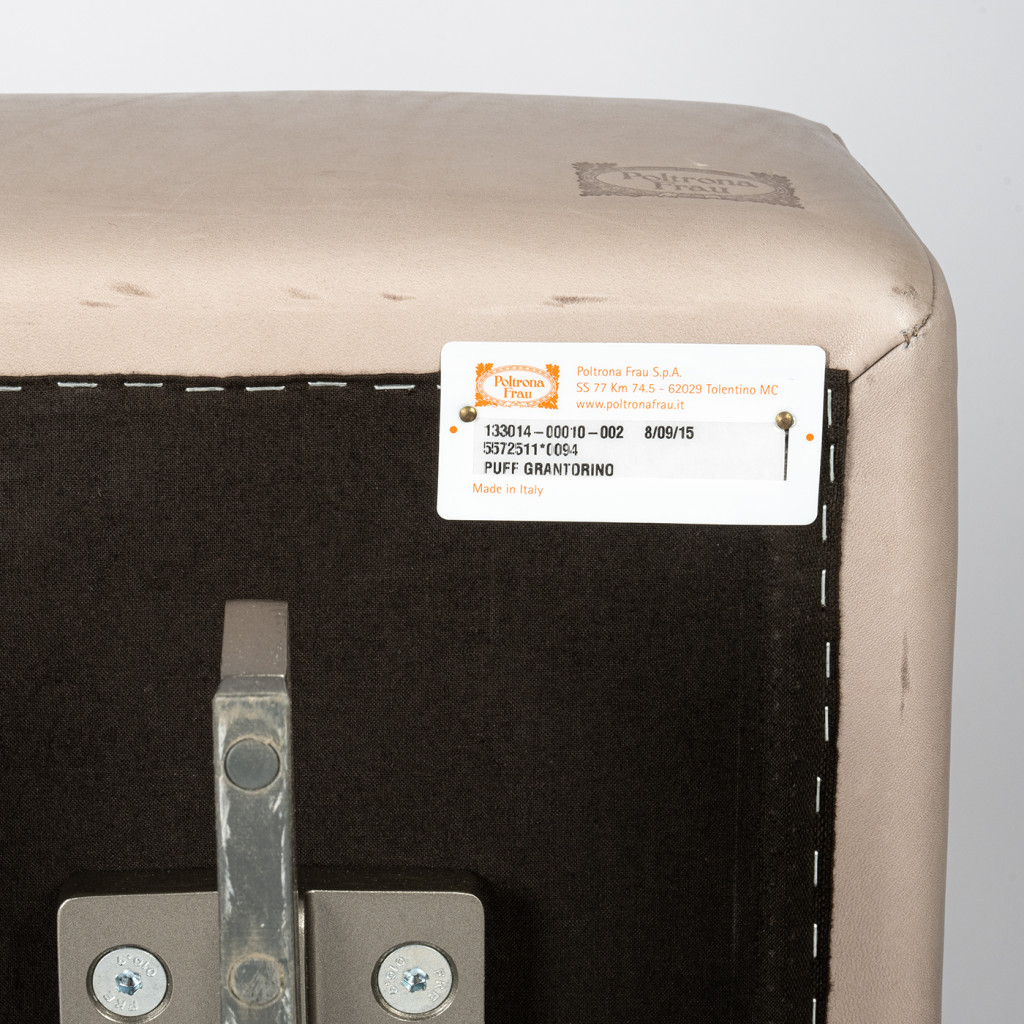 Ottoman je vyrobený z kvalitní kůže značky Pelle Frau® a polštář je plněný husím peřím. Nohy jsou vyrobeny z hliníku a lakovány do barvy titanu. Netkaná textilie Je ve spodní části na jednom místě protržená. Jinak je ve velmi dobrém původním stavu.