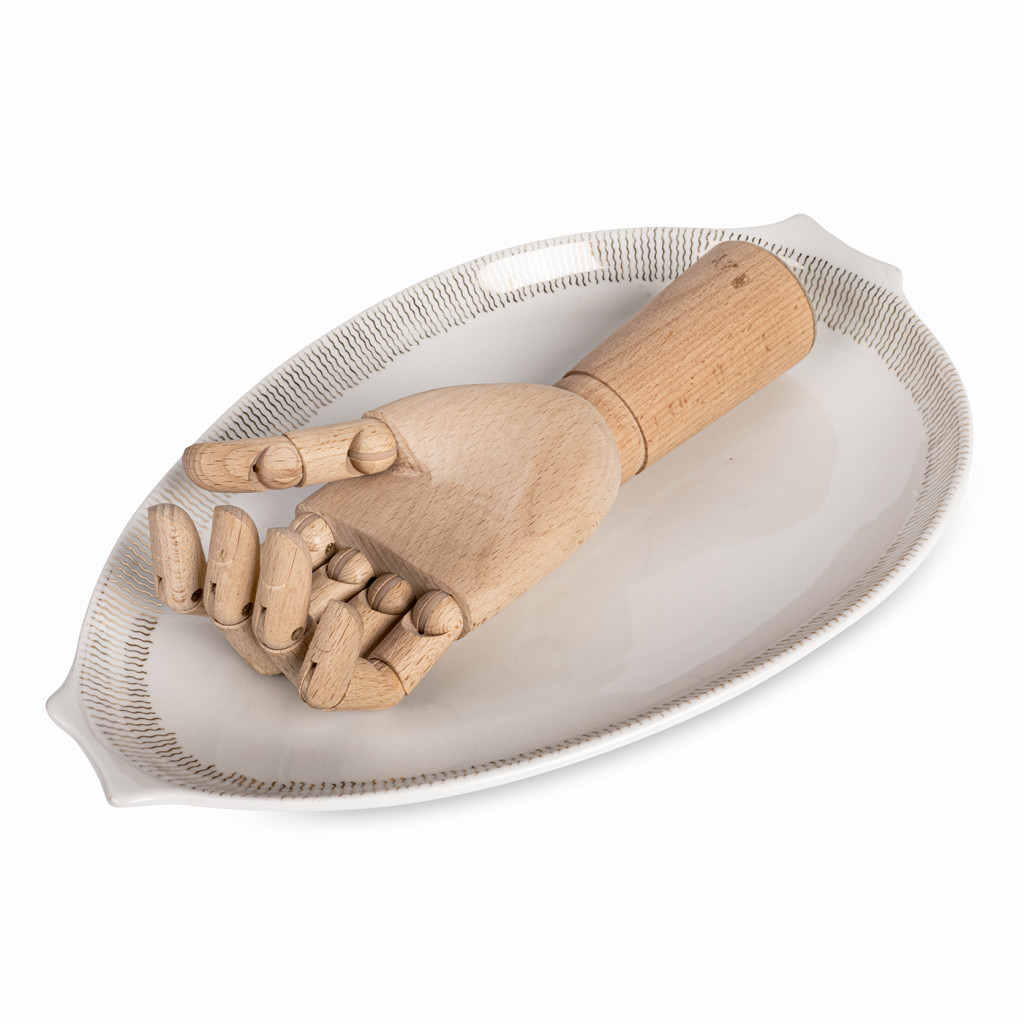 Porcelánový tác vyrobený v 60. letech československou porcelánkou Cornelia Loučky. Ta byla založena v roce 1907 a její doménou byly luxusní zdobené jídelní servisy a šálkové sety. Porcelánka nádobí často přebírala od jiných výroben a následně upravovala vlastními technikami. Ikonickými se například staly pastelové šálky se zlaceným či listrovaným vnitřkem.