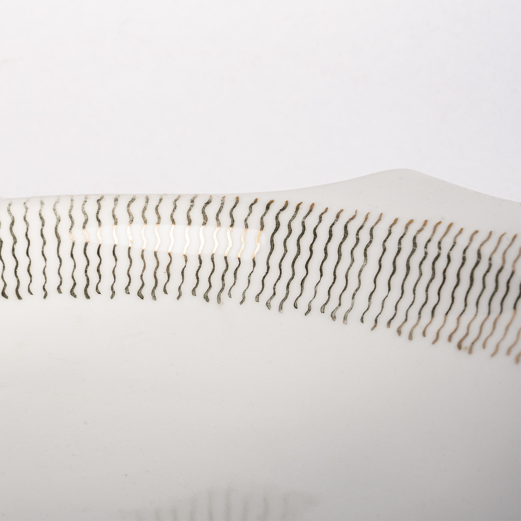 Tento tác má asymetrický oválný tvar a jeho kraj lemuje dekorativní motiv drobných zlatých vlnovek. Tác je ve výborném původním stavu, spodní okraj má lehkou patinu.