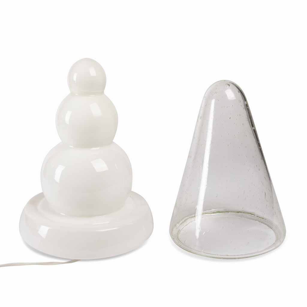 Atypická stolní lampička vyrobená z několika vrstev skla. Tvarovaný vnitřní díl z mléčného skla je krytý zakulaceným jehlanem, který je vyrobený z čirého skla se zatavenými bublinkami. Po rozsvícení mléčné sklo vytváří příjemné rozptýlené světlo a zároveň vynikne tvar vnitřního dílu. Lampa je zcela funkční, ponechána v původním stavu.