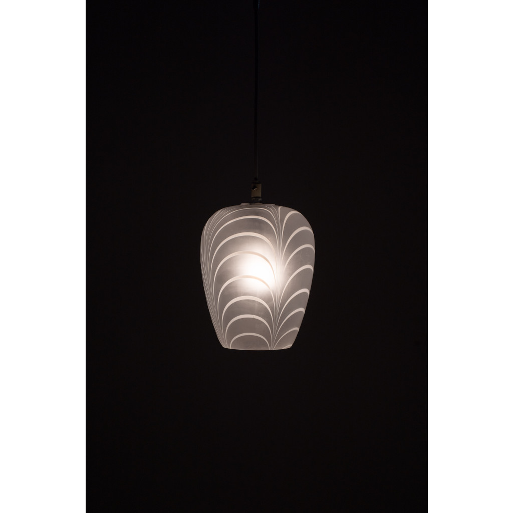 Lustr z matného průhledného skla vyrobený v 70. letech. Stínidlo ve tvaru poupěte zdobí motiv oblých linek z mléčného skla. Visí na gumovém kabelu s kovovým kuželovitým zakončením a gumovým těsněním.