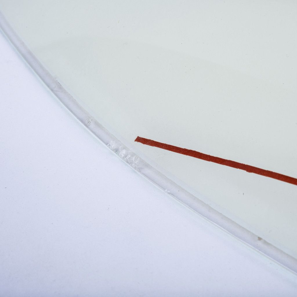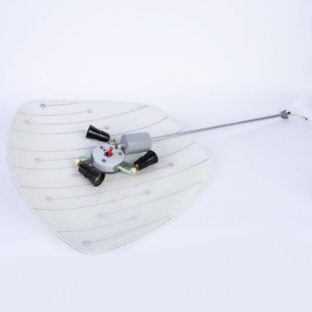 Skleněný lustr v bruselském stylu. Skleněné stínidlo s geometrickým vzorem visí na chromované kovové tyči. Konstrukce nese známky používání, na jednom místě je stržený závit. Celkově zachovalý kus.