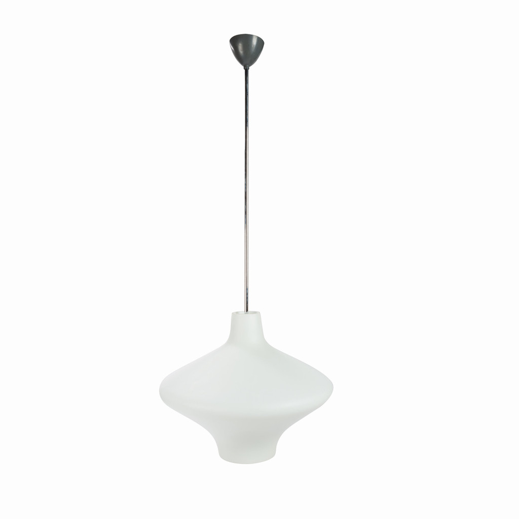 Skleněný lustr vyrobený v šedesátých letech v podniku Osvětlovací sklo Valašské Meziříčí. Sklárna ve Valašském Meziříčí byla dříve hlavní sklárnou společnosti S. Reich & Co, největšího výrobce osvětlovacího skla v Rakousku-Uhersku. Lustr má skleněné stínidlo z opálového skla v matném bílém provedení. Tvar stínidla odpovídá futuristickým tendencím sedmdesátých let, která byla ovlivněna uměleckou tendencí Space Age. Lustr má kovový závěs ve stříbrné barvě, je zcela funkční, ve výborném původním stavu.