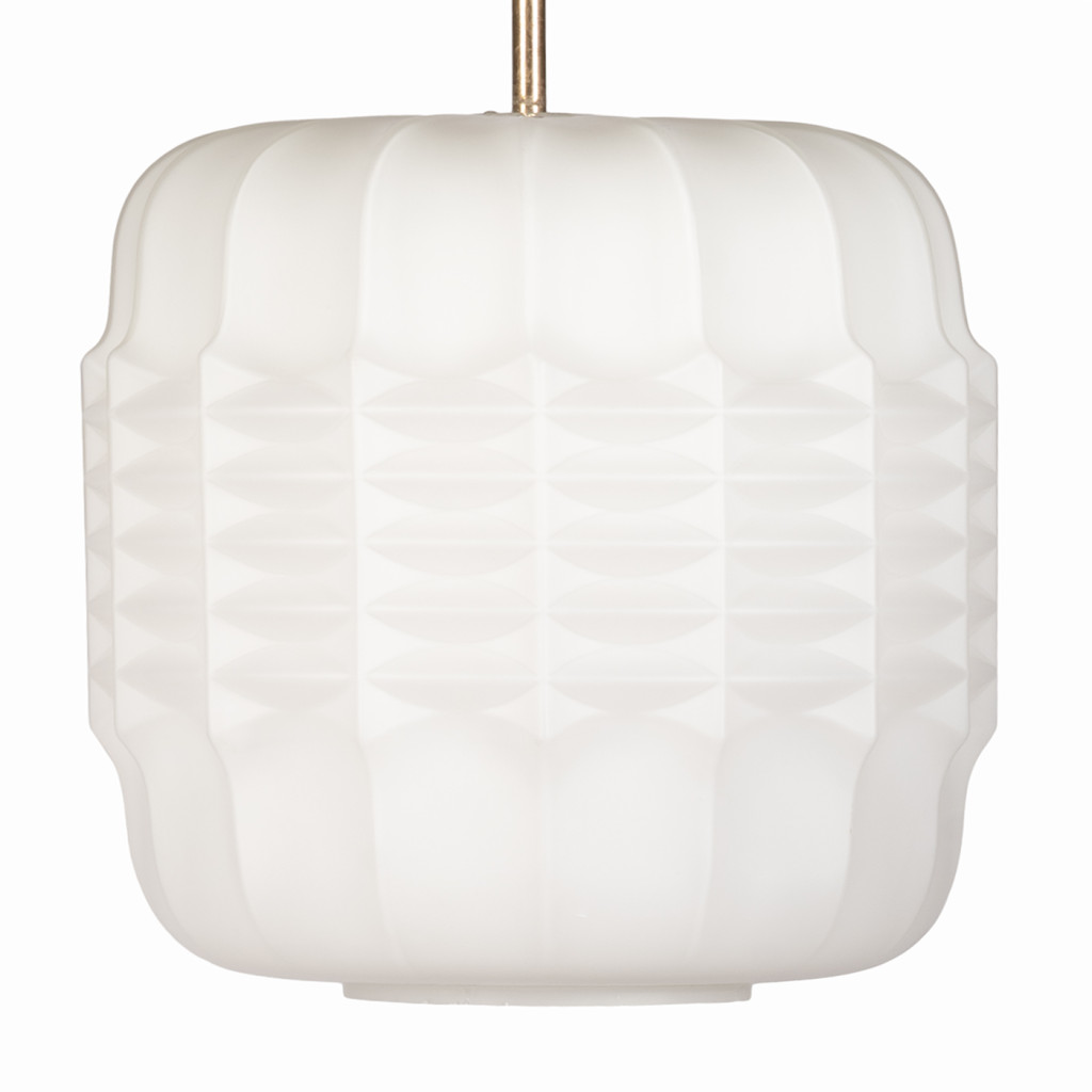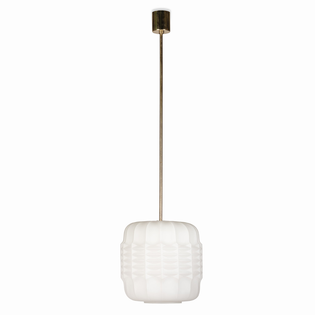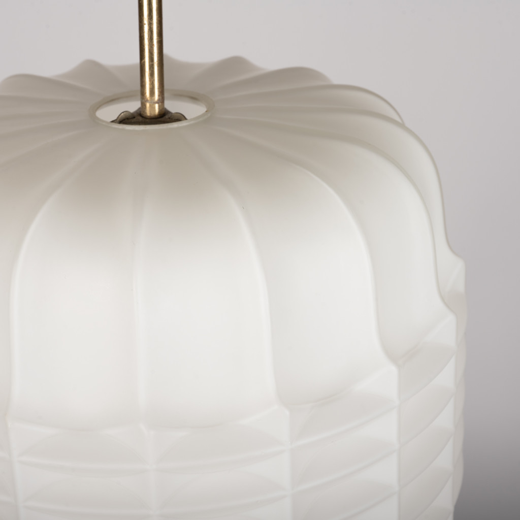 Skleněný lustr vyrobený v 70. letech národním podnikem Osvětlovací sklo ve Valašském Meziříčí. Sklárna ve Valašském Meziříčí byla dříve hlavní sklárnou společnosti S. Reich & Co, největšího výrobce osvětlovacího skla v Rakousku-Uhersku. Lampionovité stínidlo je vyrobeno z bílé matované, vrstvené triplex opálové skloviny - materiálu, který díky trojímu lomu vytváří příjemné, rozptýlené světlo. Světlo má mosaznou závěsnou tyč a je zcela funkční ve skvělém původním stavu, pouze tyč má přirozenou patinu. Svítí na jednu žárovku se závitem E27.