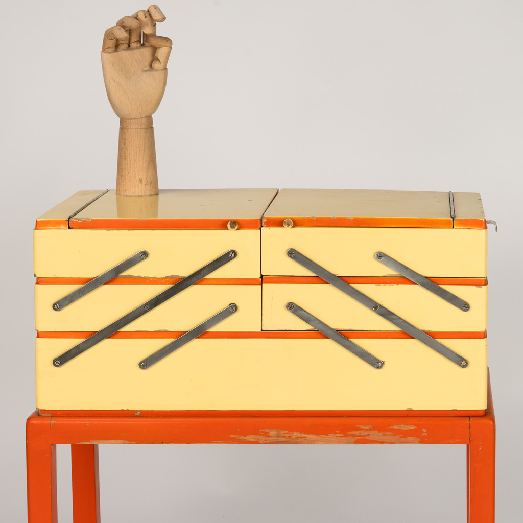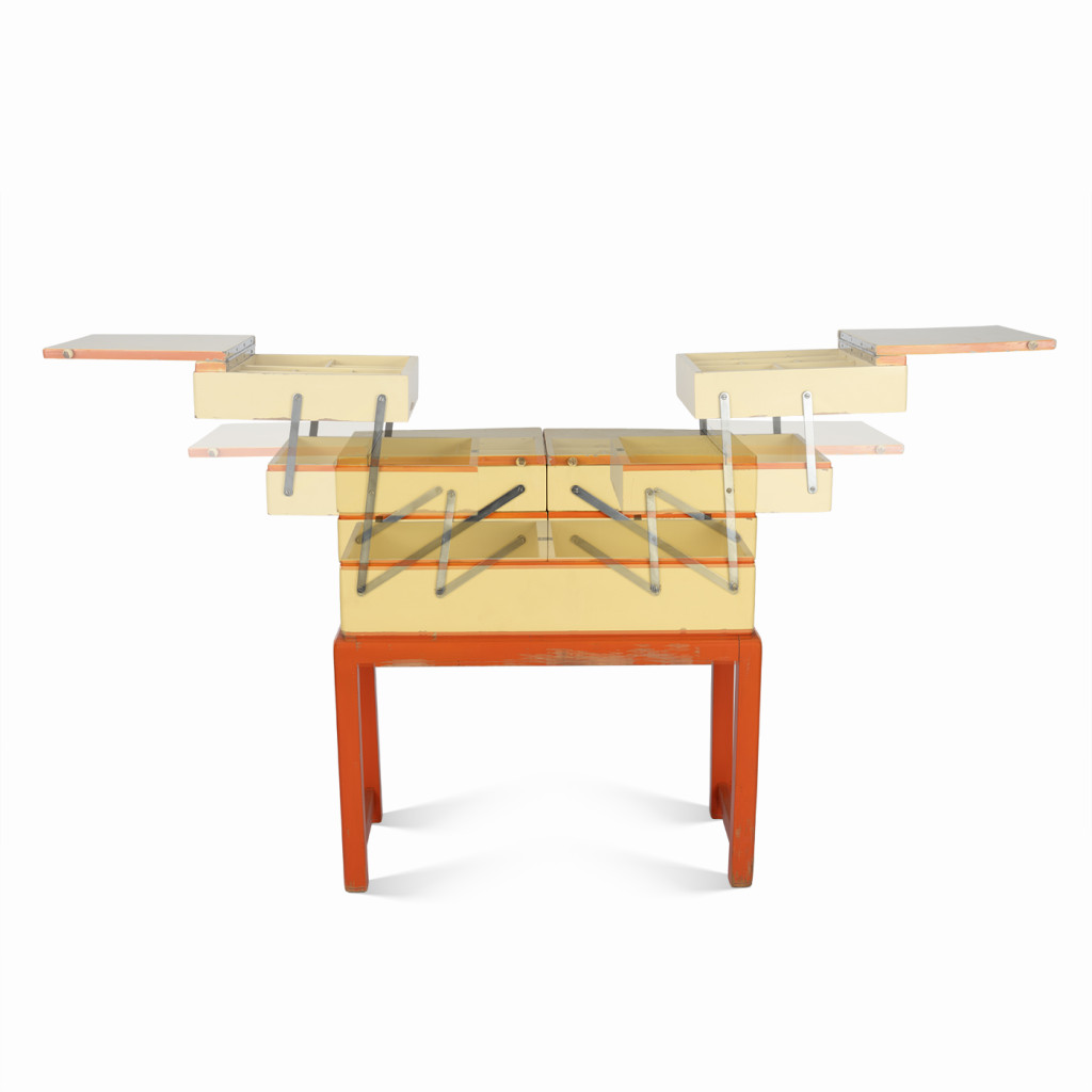 Původní art deco skříňka na šicí potřeby s klasickým postranním vyklápěcím mechanismem nabízí tři úrovně úložných přihrádek. Skříňka je vyrobena z kombinace bukového masivu a překližky a stojí na pevné ocelové konstrukci se sytě oranžovým emailovým nátěrem. Tělo skříňky zdobí email vanilkové barvy s oranžovým lemováním a kovové panty.