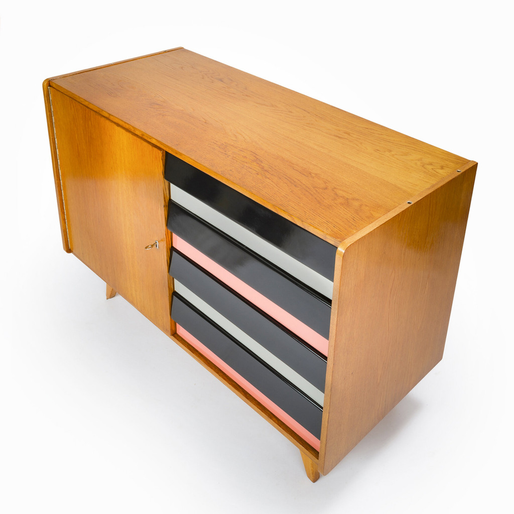 Skříňka U-458 je vhodná do jakékoliv místnosti, je skladná a poměrně lehká, takže se s ní snadno manipuluje. Je rozdělena na úložnou část s podélnou policí a část se čtyřmi šuplíky v šedé a pastelově růžové barvě s černými úchytkami. Má dýhovaný (dub) povrch, podnož je vyrobená ze smrkového masivu. Postup renovace jsme konzultovali s Jiřím Jiroutkem, od kterého máme od roku 2018 také výhradní právo na obnovu výroby celé řady U-450.
