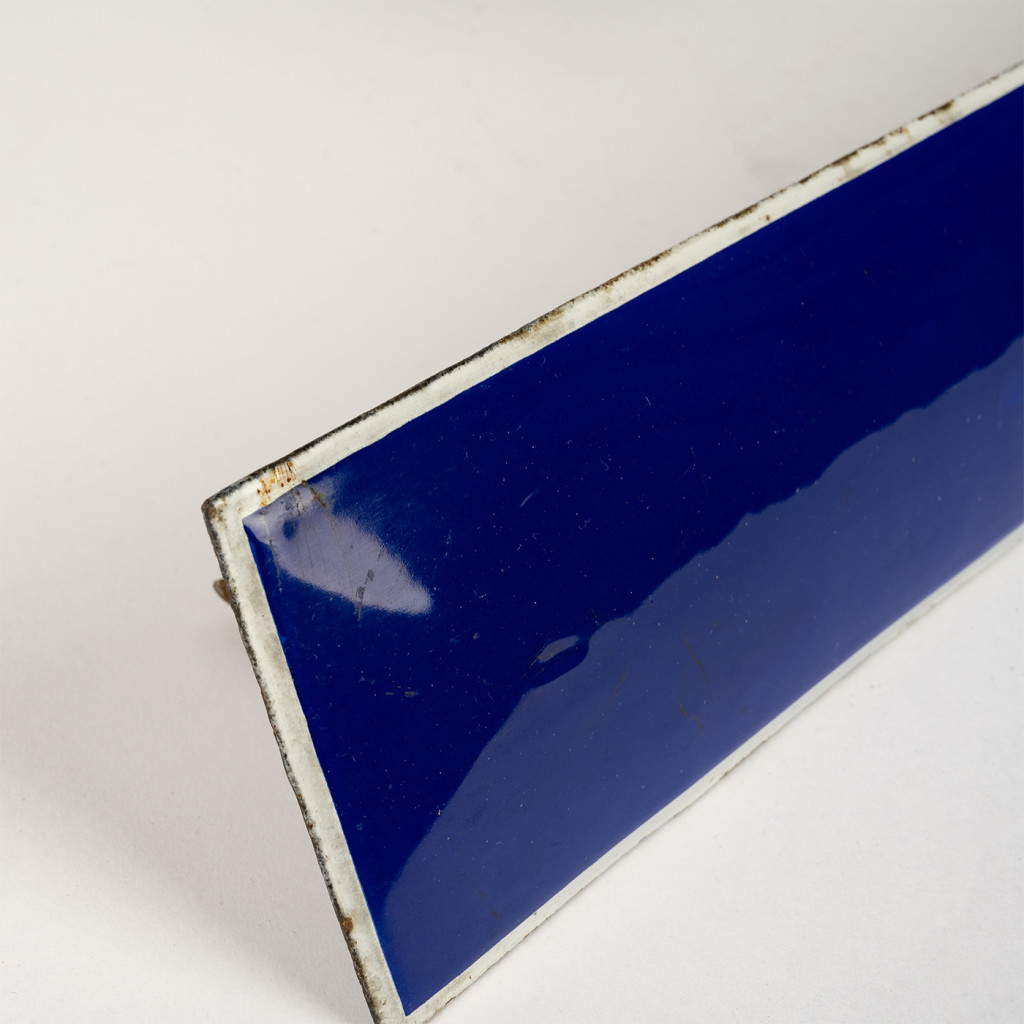 Smaltované písmeno z původní vývěsky jednoduchého fontu. Přední strana písmene je jemně vyboulená, takže působí plasticky a je opatřena tmavě modrým nátěrem s bílou konturou. Písmeno je ponecháno v původním stavu, s autentickou patinou. Barva je na některých místech poškozena. Původní uchycení z druhé strany je poškozené.