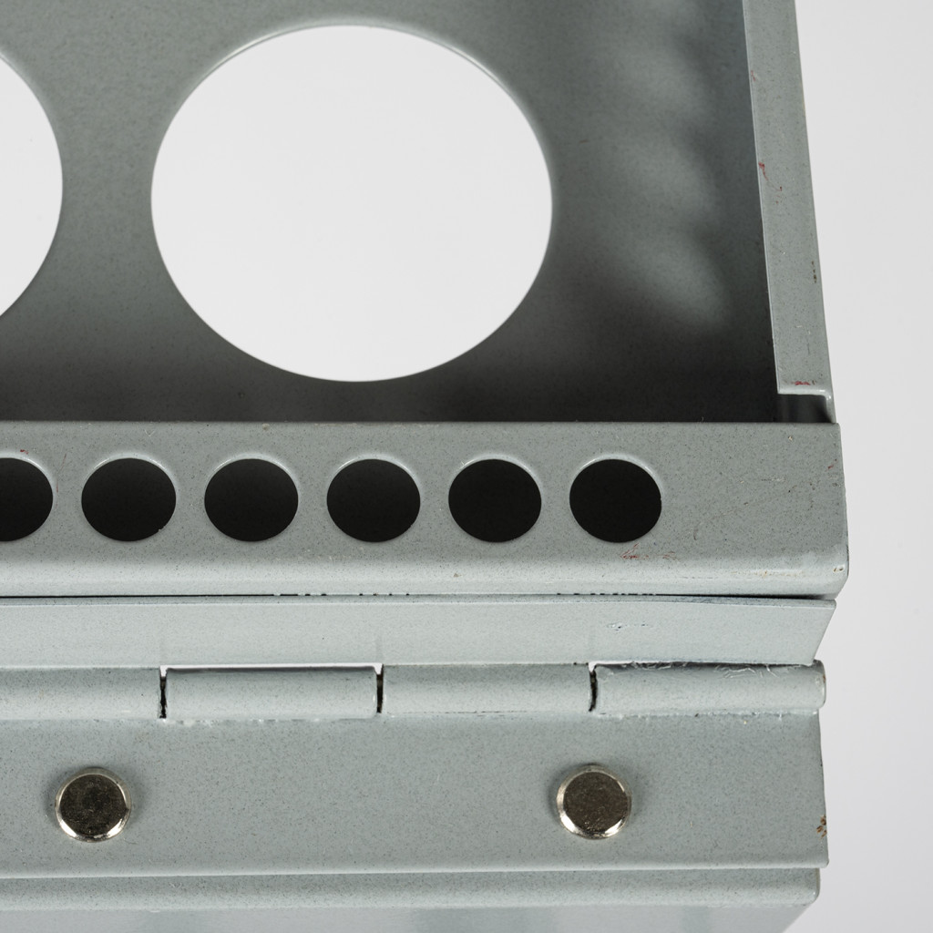 Stojan v cik-cak designu nabízí tři úrovně a dohromady šest přihrádek k uložení novin a časopisů formátu A4 z obou stran. Kovové plošky perforované kulatými otvory jsou spojené kovovými příčkami a v kloubech upevněny nýty. Díky harmonikové konstrukci je možné stojan složit do úsporného obdélníkového tvaru.