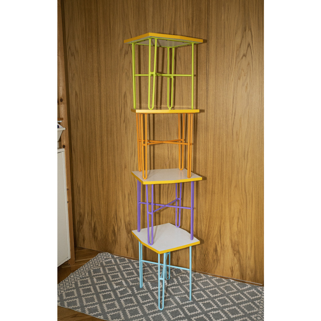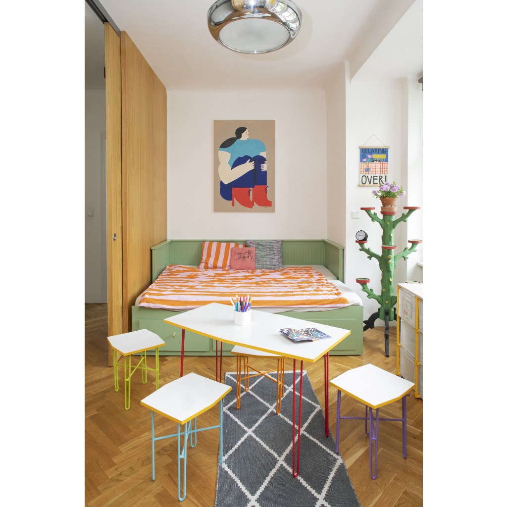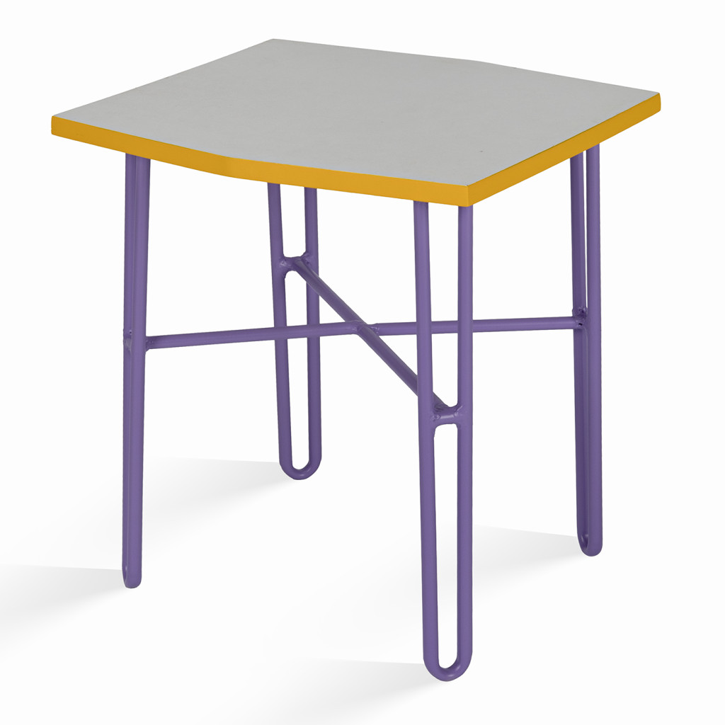Desky mají lehce asymetrický tvar a jsou vyrobeny z kombinace překližky a umakartu v bílo-šedém odstínu se žlutým lemováním. Leží na vysokých nožkách z ohýbané oceli s křížovou konstrukcí. Nohy stolu jsou natřené červeně, nožky židliček fialově, oranžově, světle modře a světle zeleně.