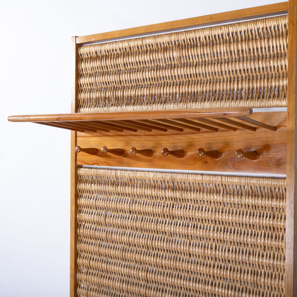 Věšáková stěna ÚLUV z kombinace třešňového, bukového a dubového dřeva, doplněná o ručně pletený ratanový výplet. Horní část tvoří lišta s kulatými háčky a integrovanou poličkou. Stěna je plně funkční a připravená pro každodenní využití.